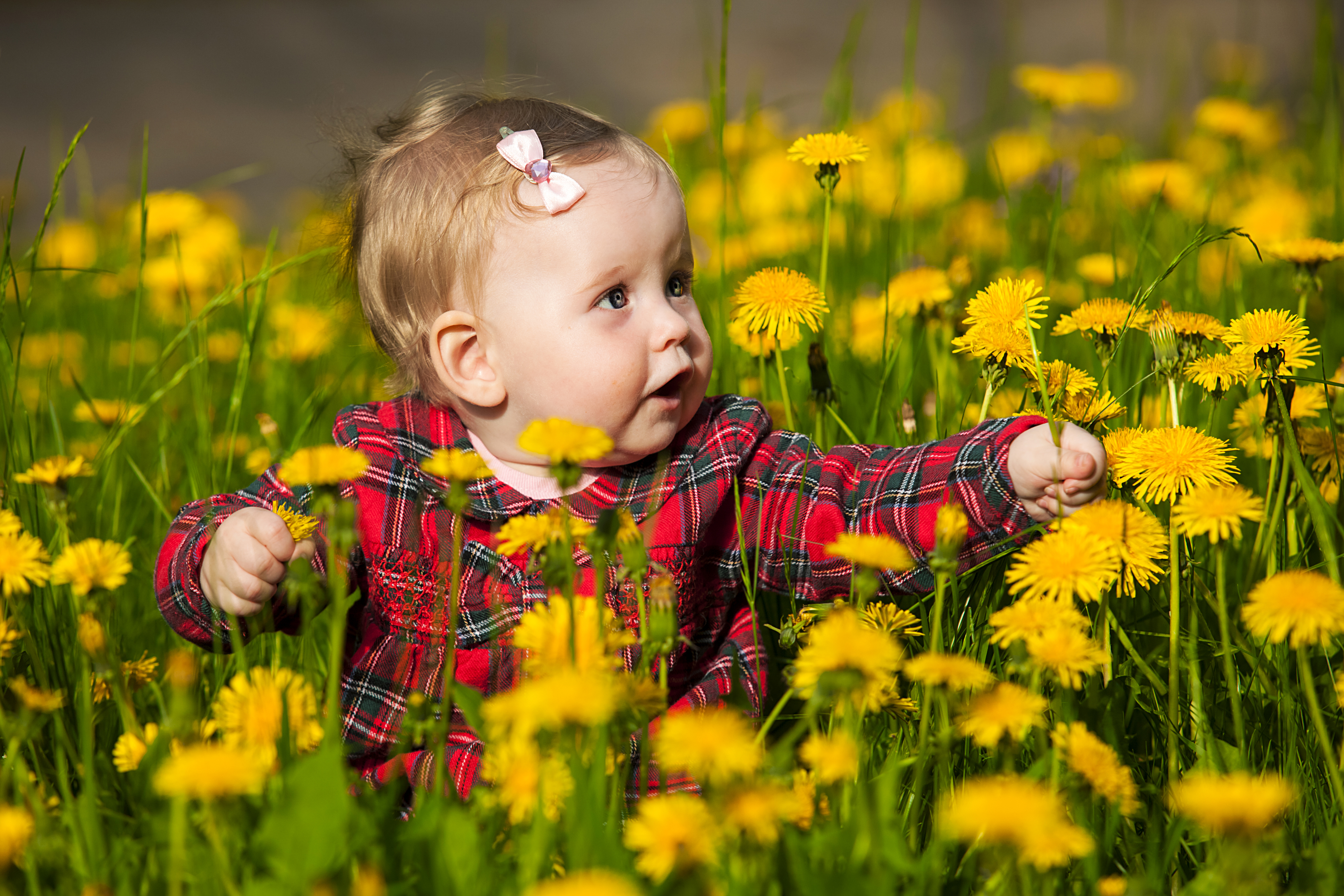 Обои: Маленькая девочка сидит в желтых одуванчиках
