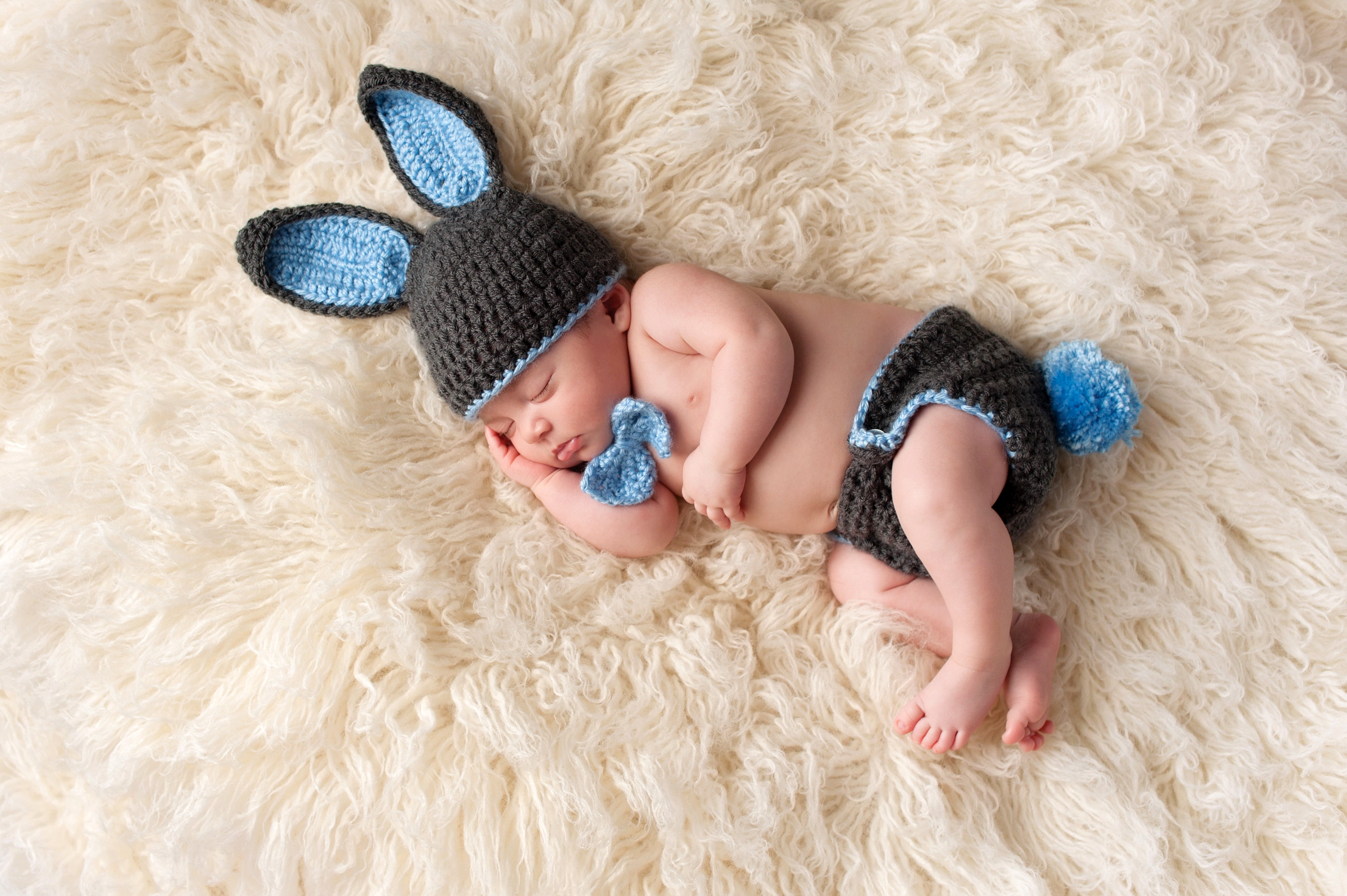 Спящий грудной ребенок в вязаном костюме кролика - 3006x2000