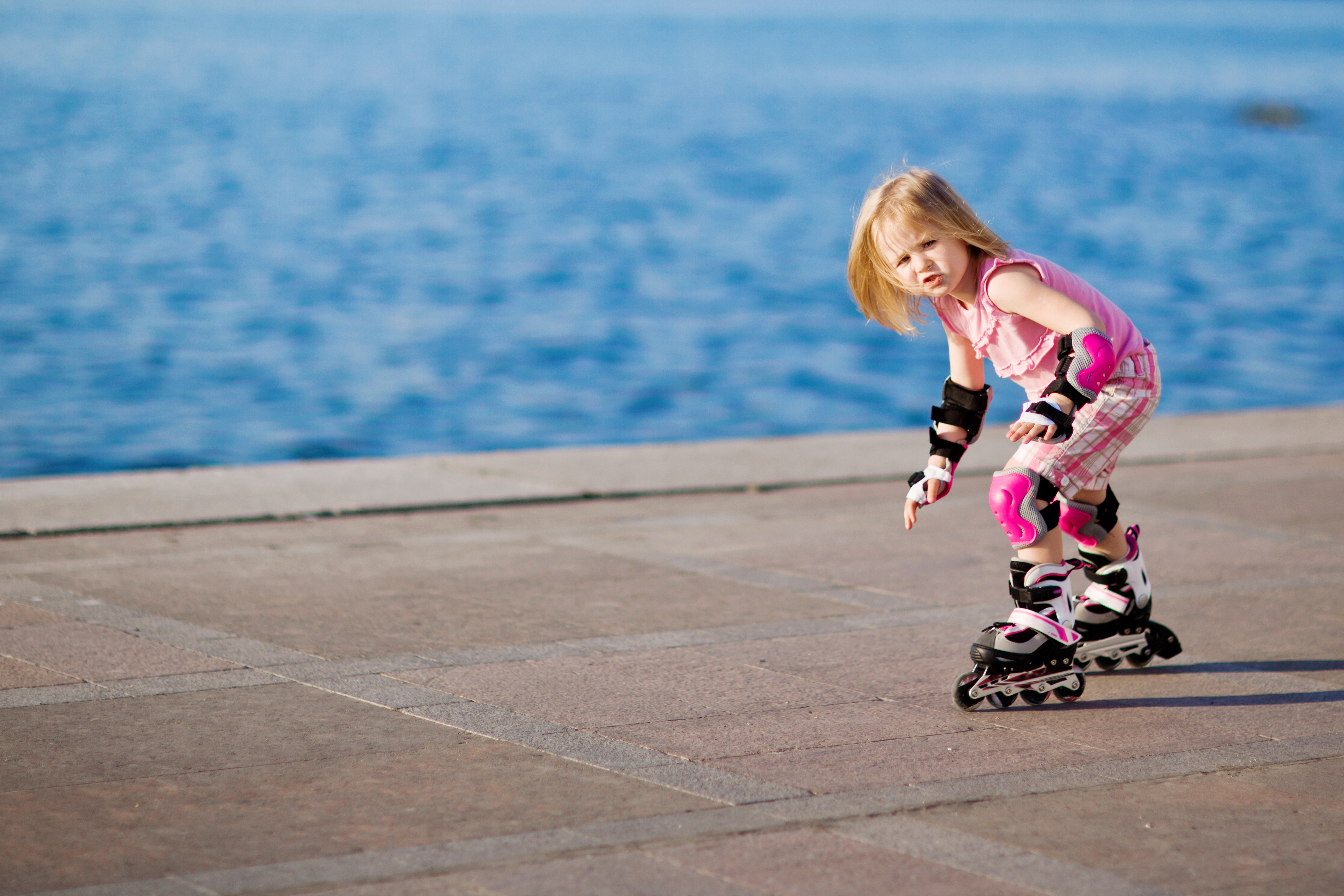 Маленькая девочка катается на роликах на побережье - 6000x4000