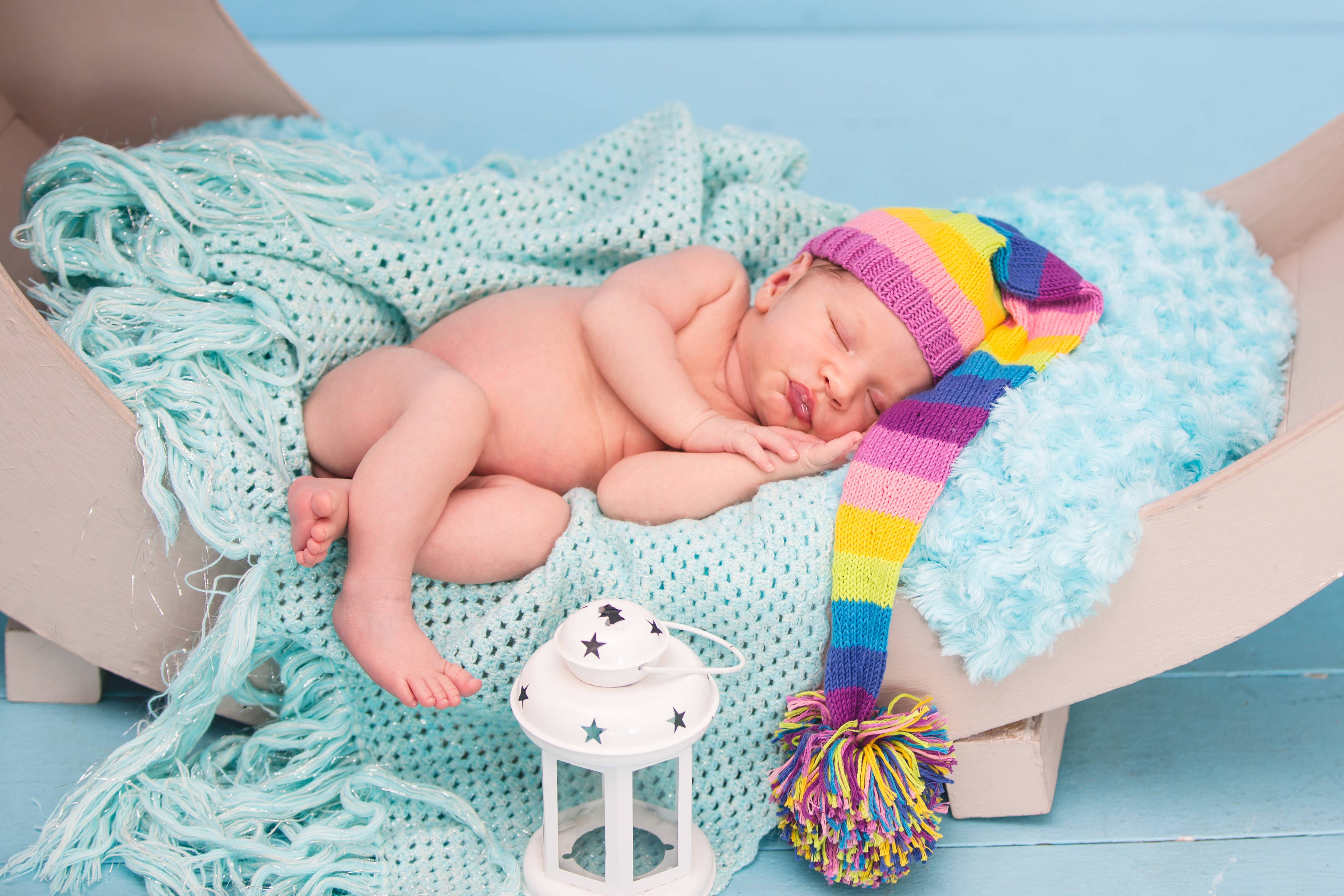 Спящий грудной ребенок в большой вязаной шапке - 4576x3051