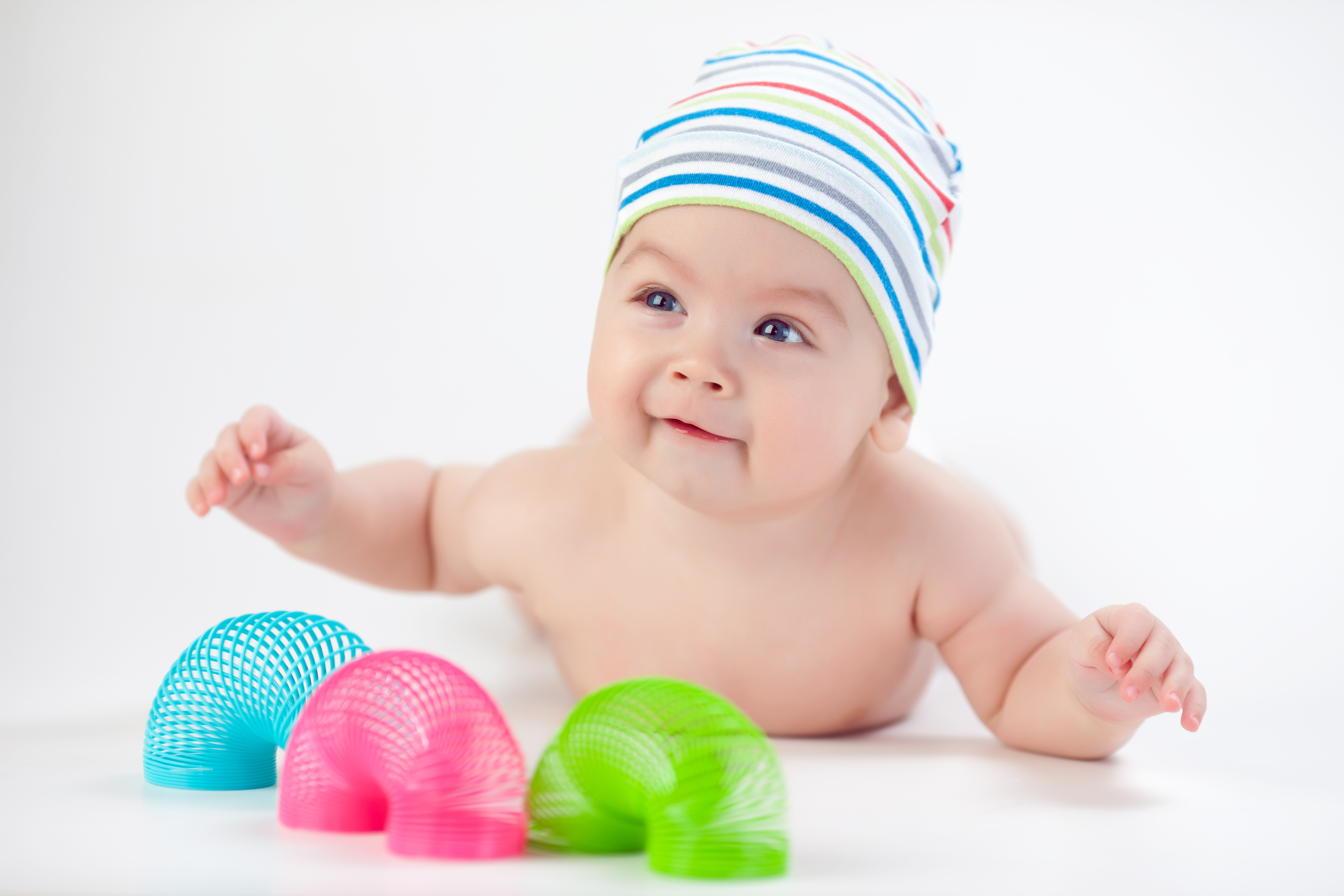 Обои: Улыбающийся грудной ребенок с игрушками радуга