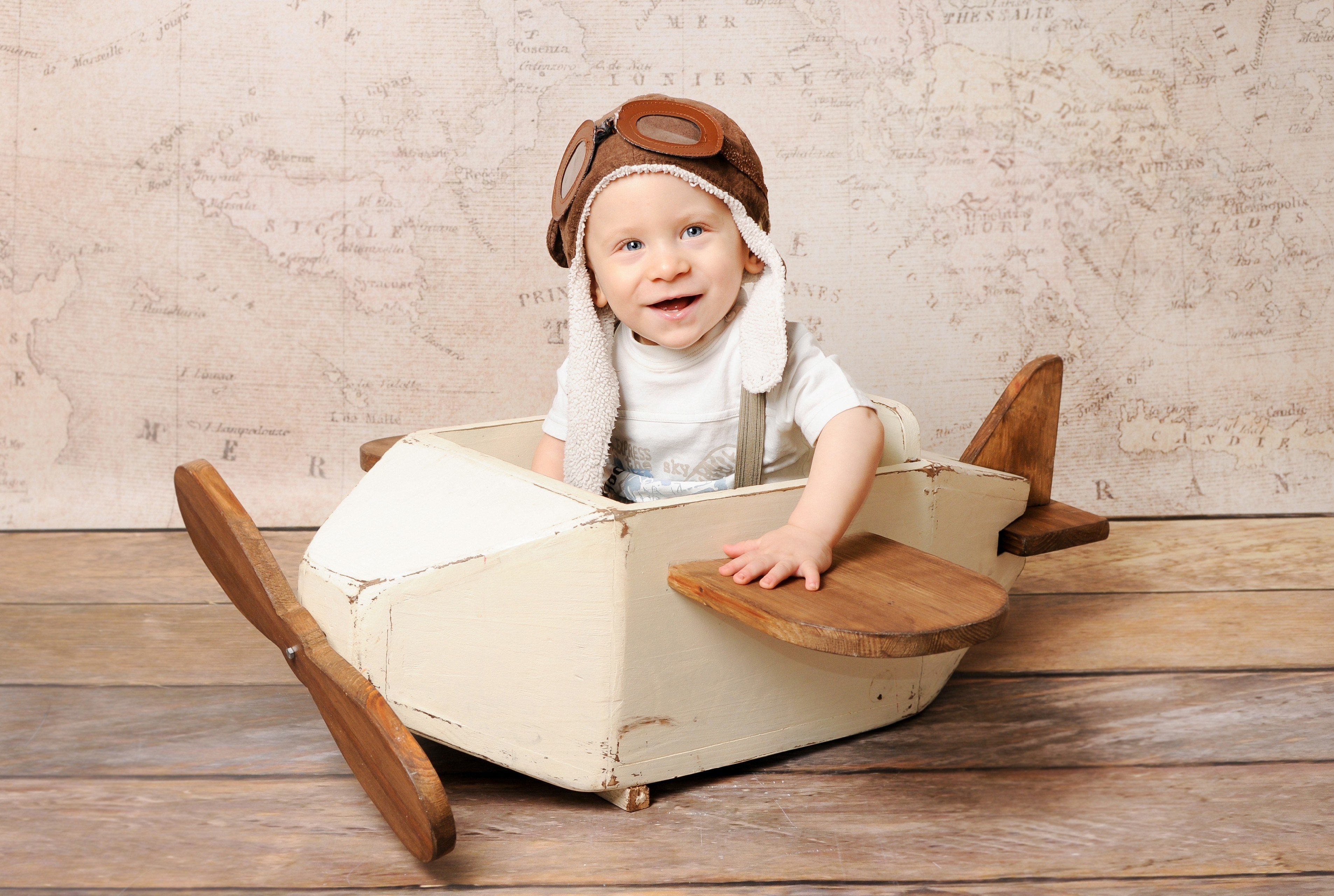 Улыбающийся маленький мальчик в игрушечном самолете - 3811x2560