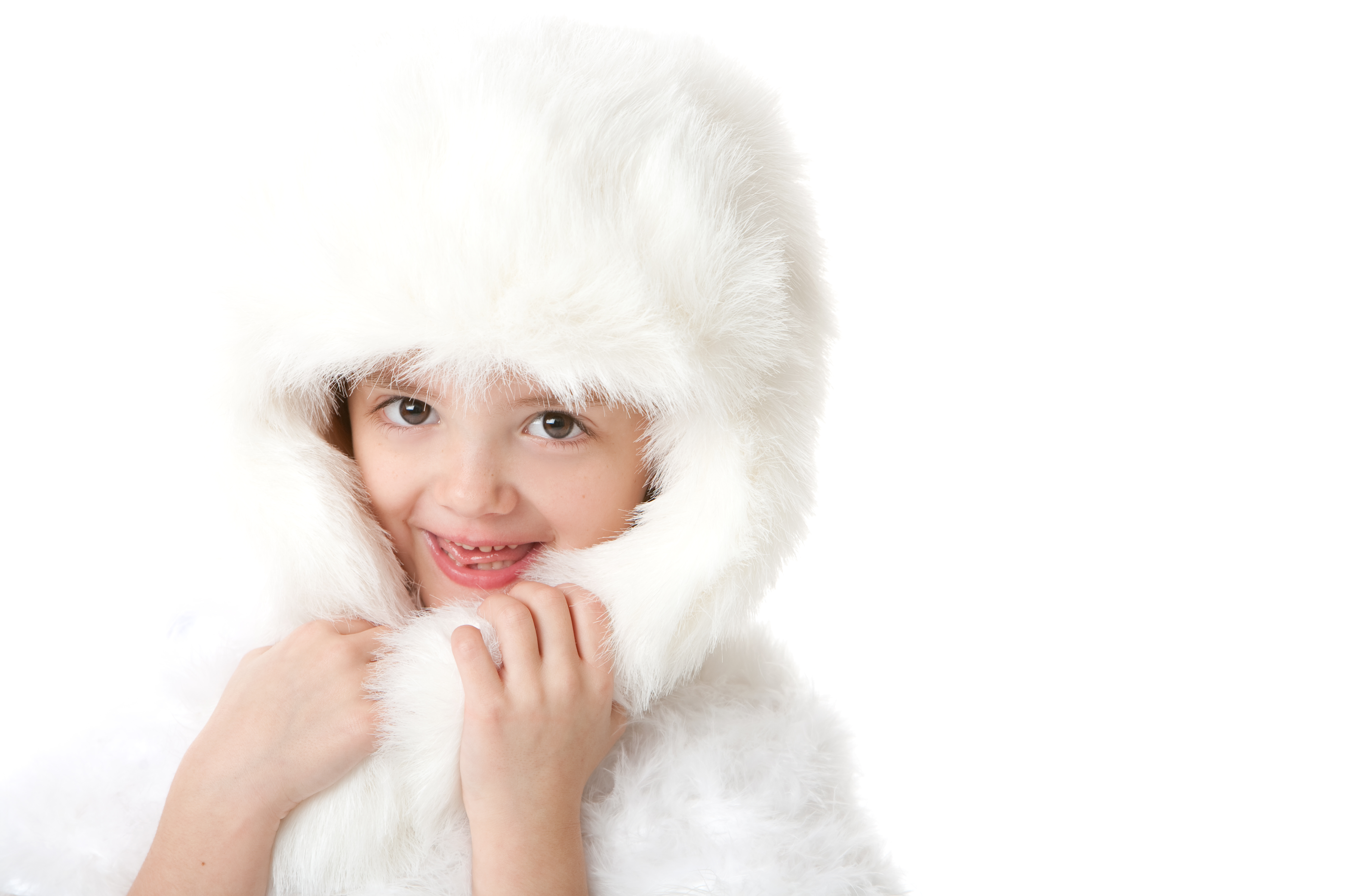 Улыбающаяся маленькая девочка в белой меховой шапке - 5286x3523