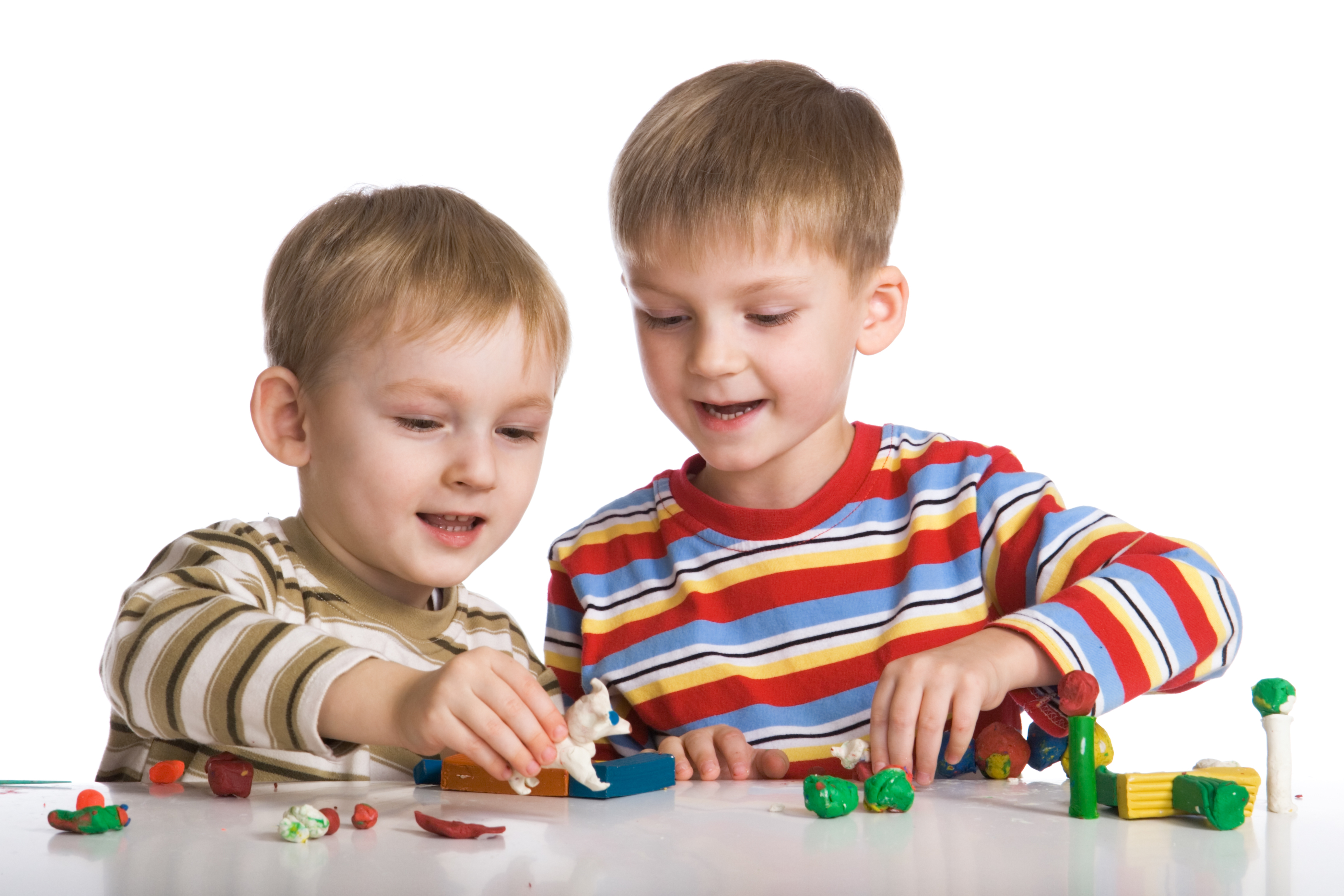 Два мальчика играют в игрушки на белом фоне - 4242x2828