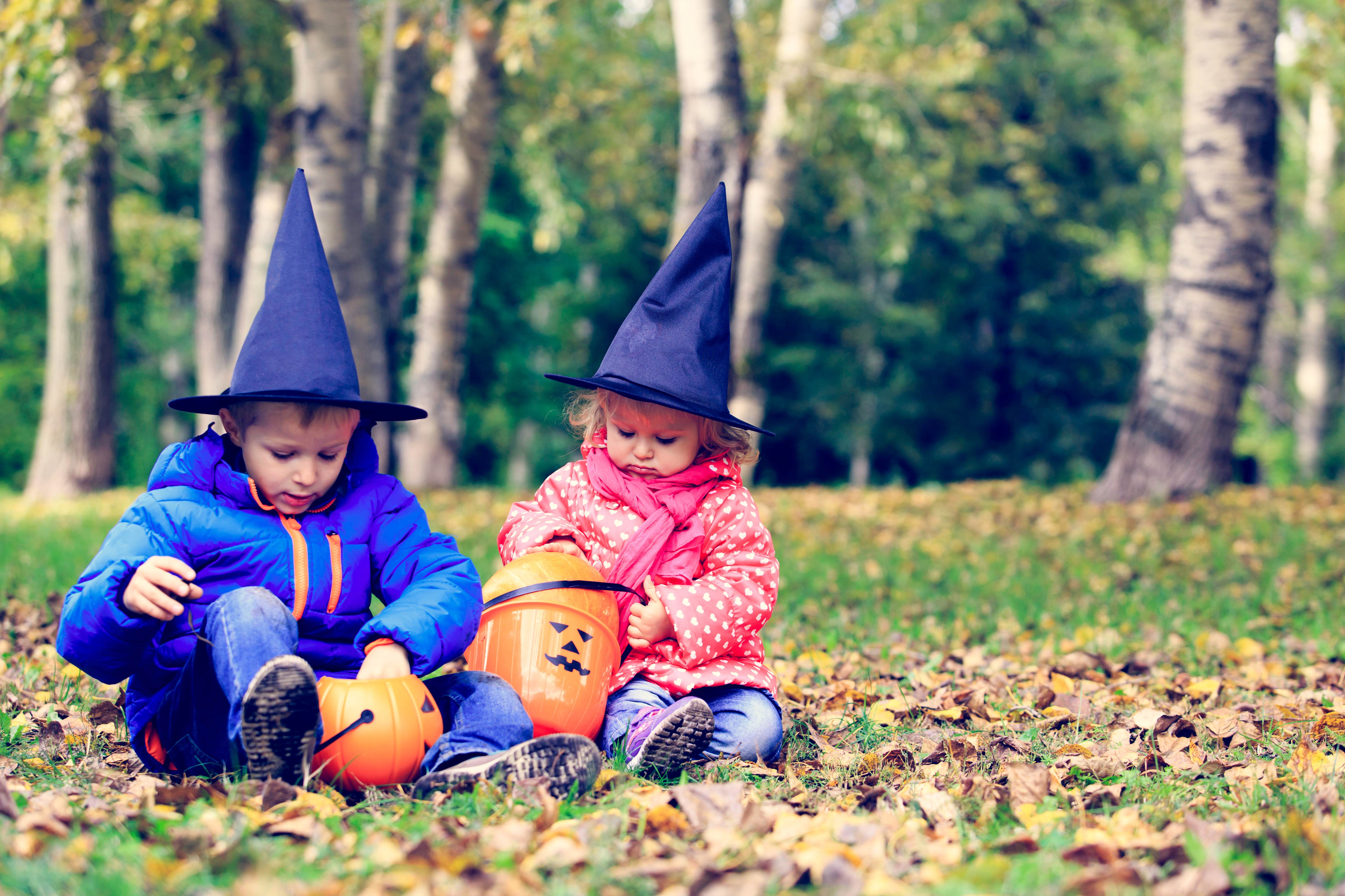 Маленькие мальчик и девочка в лесу на Хэллоуин