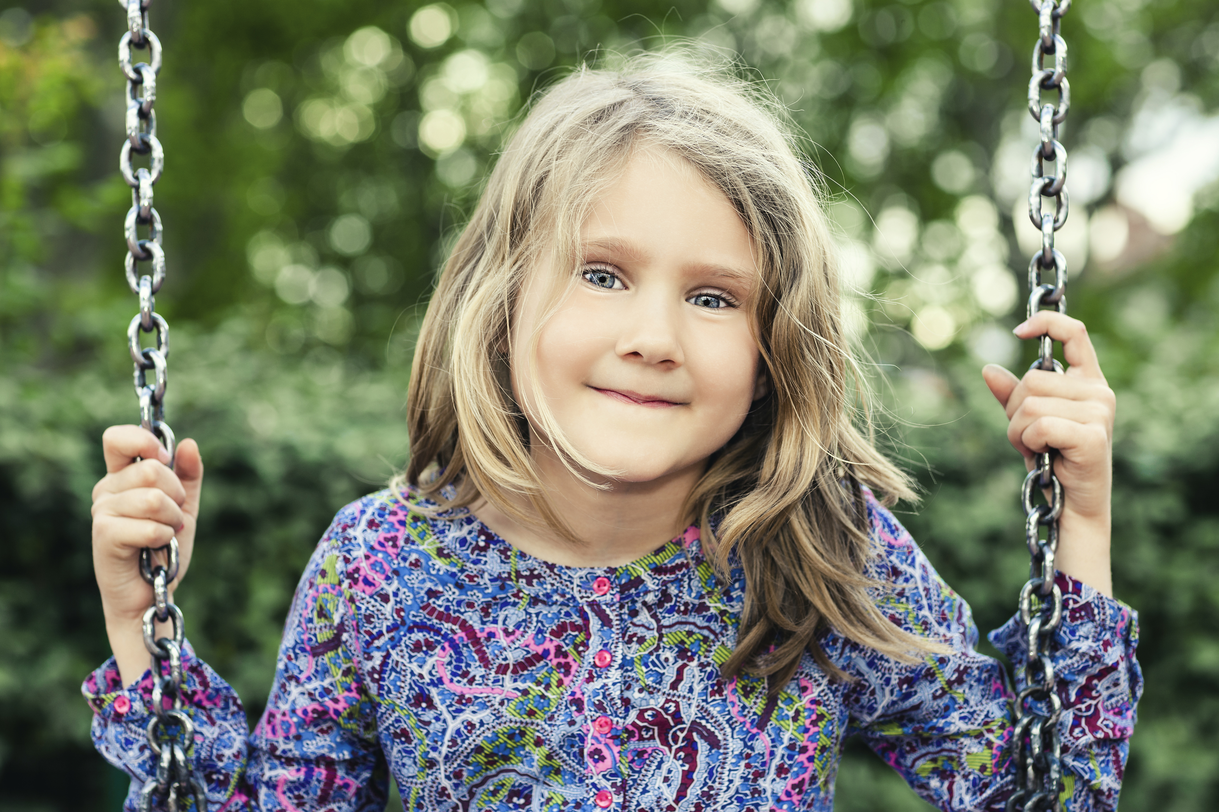 Маленькая милая голубоглазая девочка на качели - 4200x2800