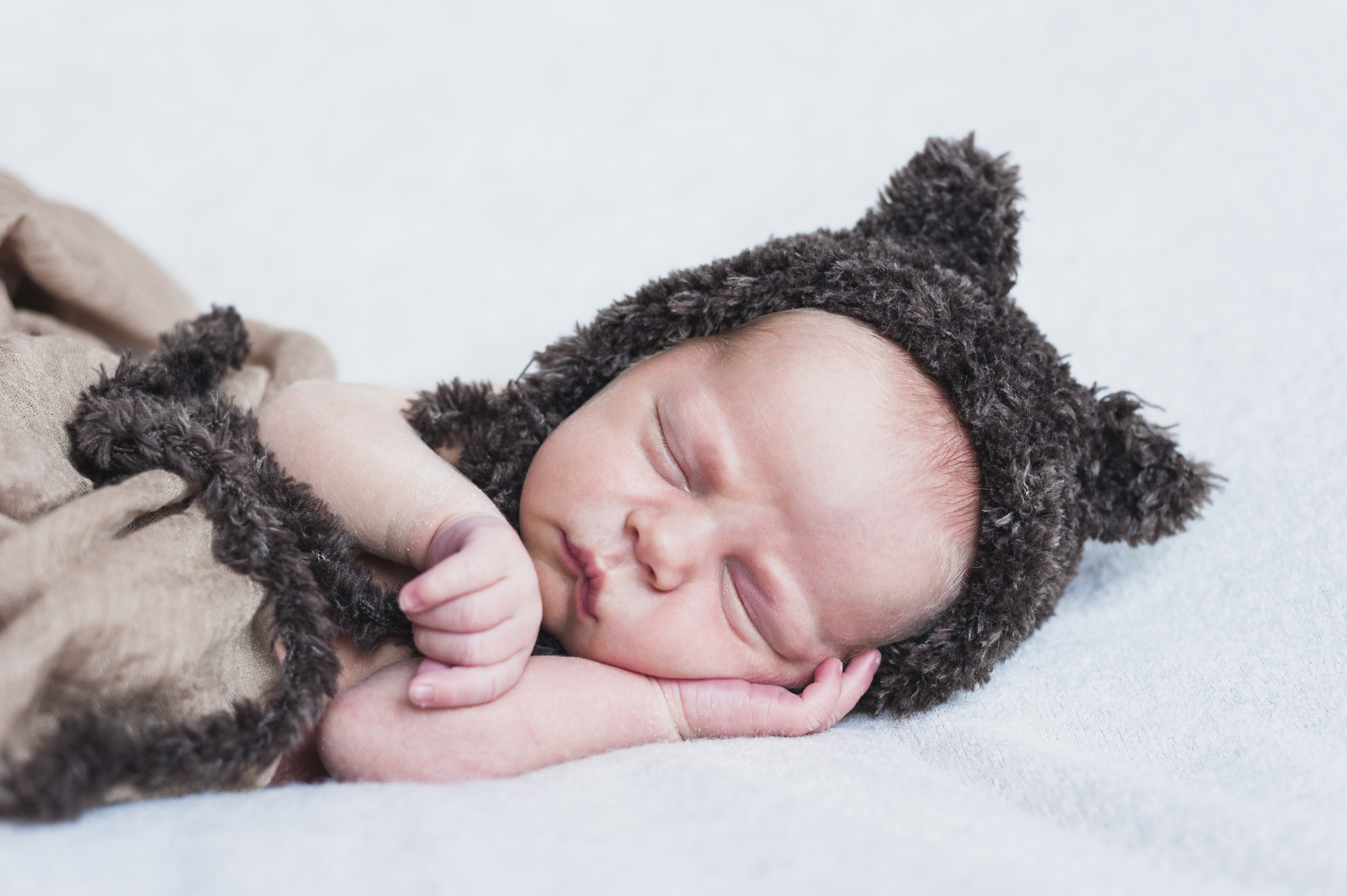 Спящий грудной ребенок в меховой шапке - 3872x2576