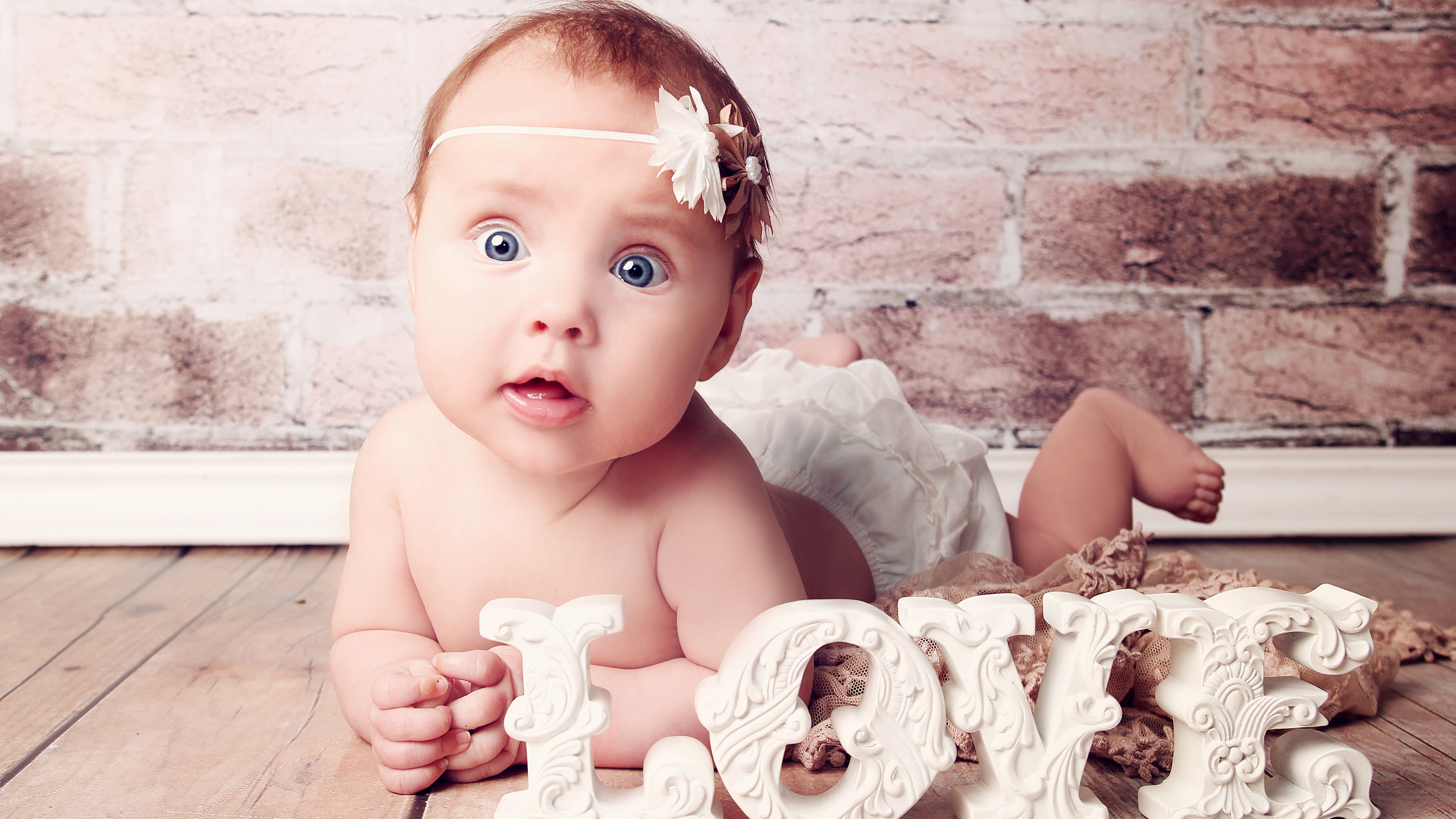 Милый голубоглазый ребенок с надписью любовь - 7680x4320
