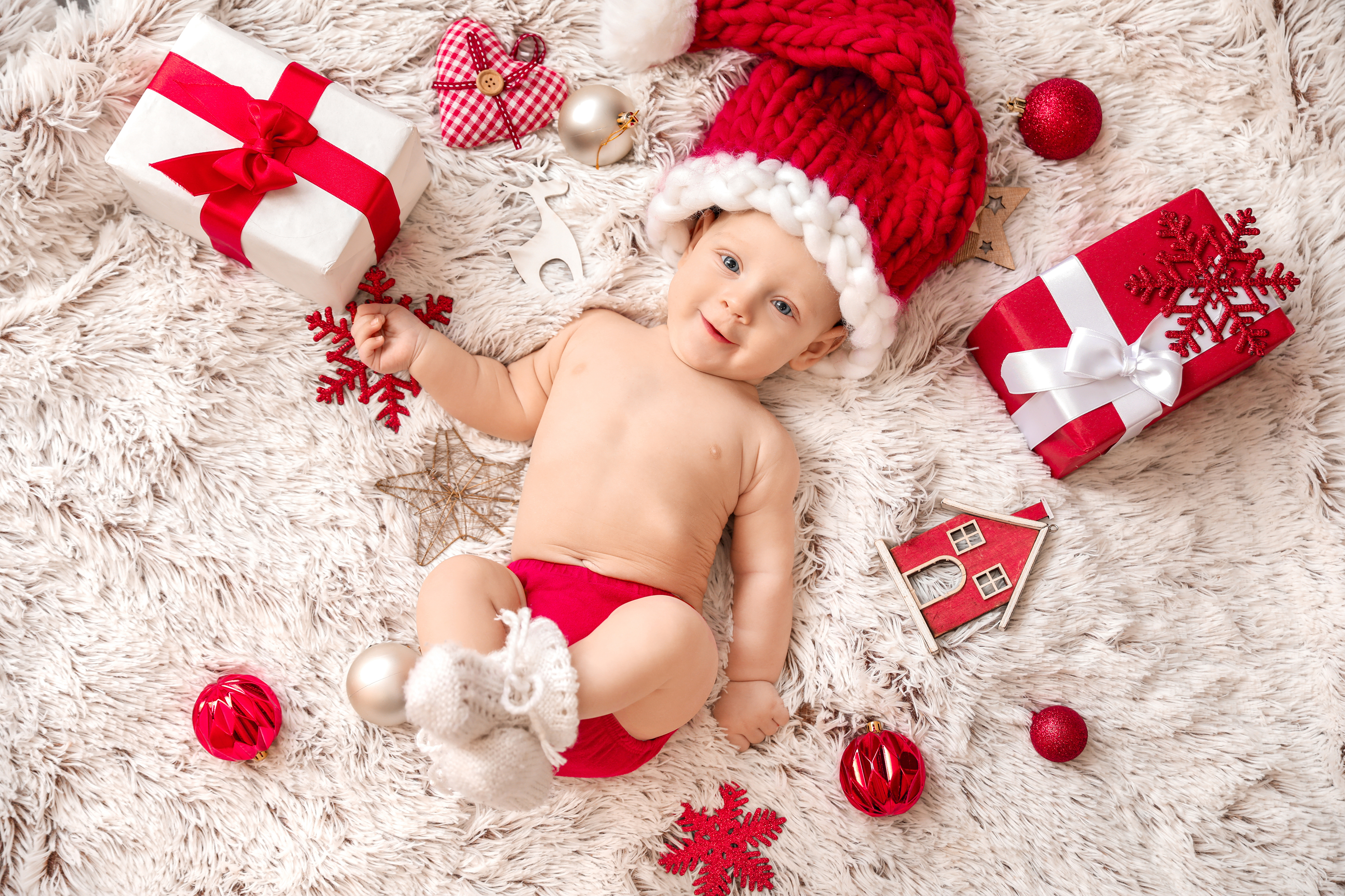 Улыбающийся ребенок в красной шапке с подарками - 5120x3413