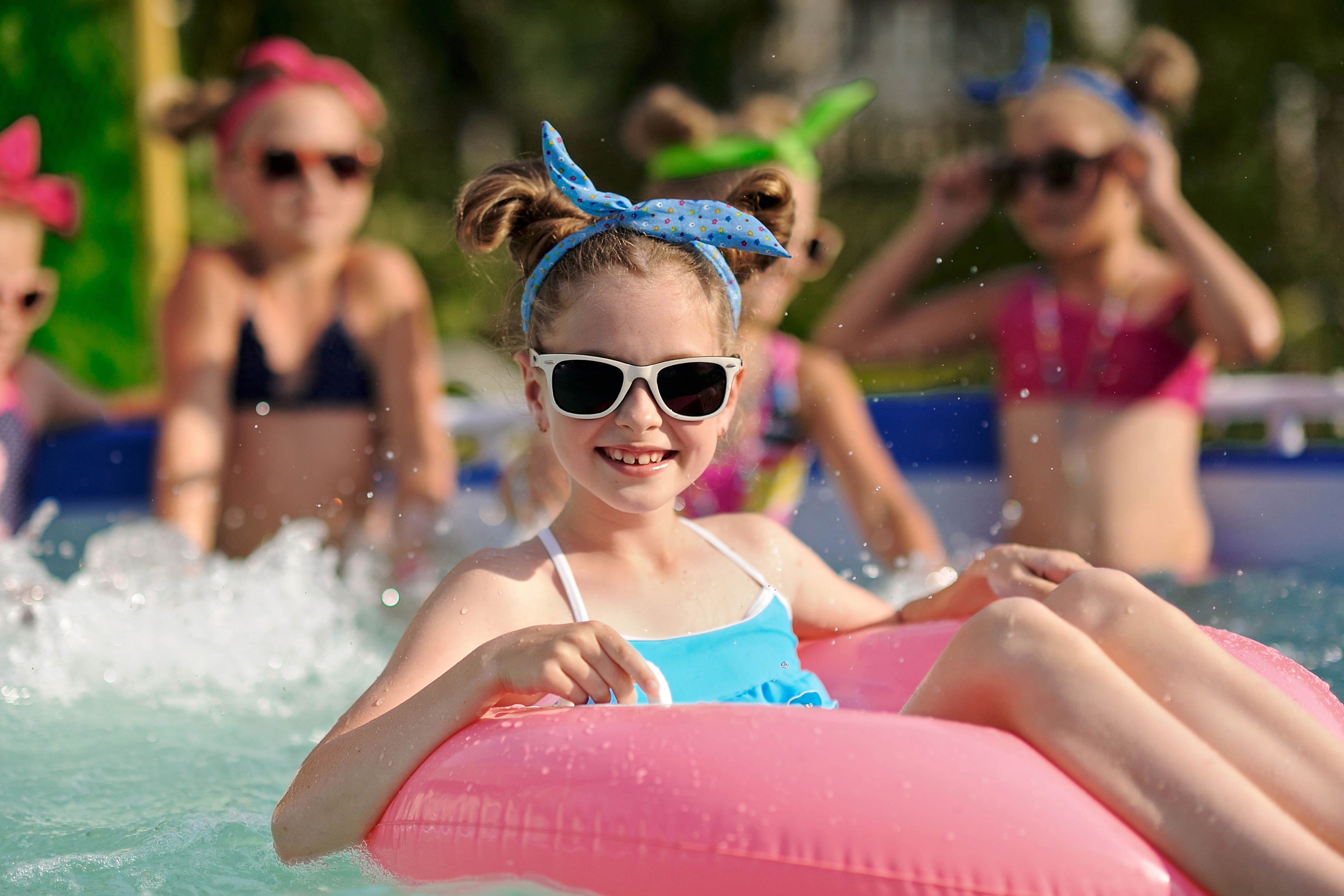 Улыбающаяся девочка со спасательным кругом в бассейне - 3750x2500