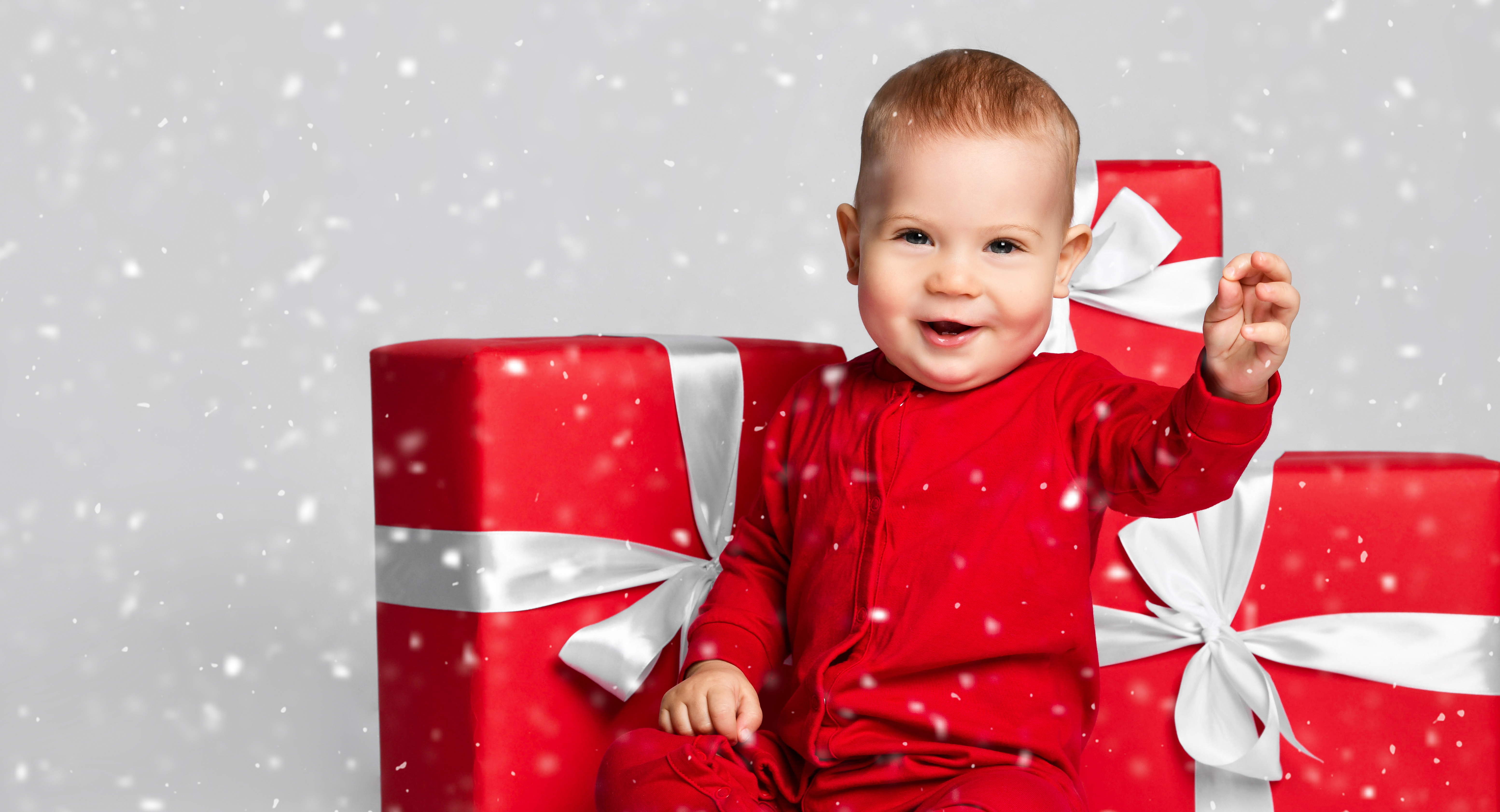 Улыбающийся ребенок с большими красными подарками - 6215x3366