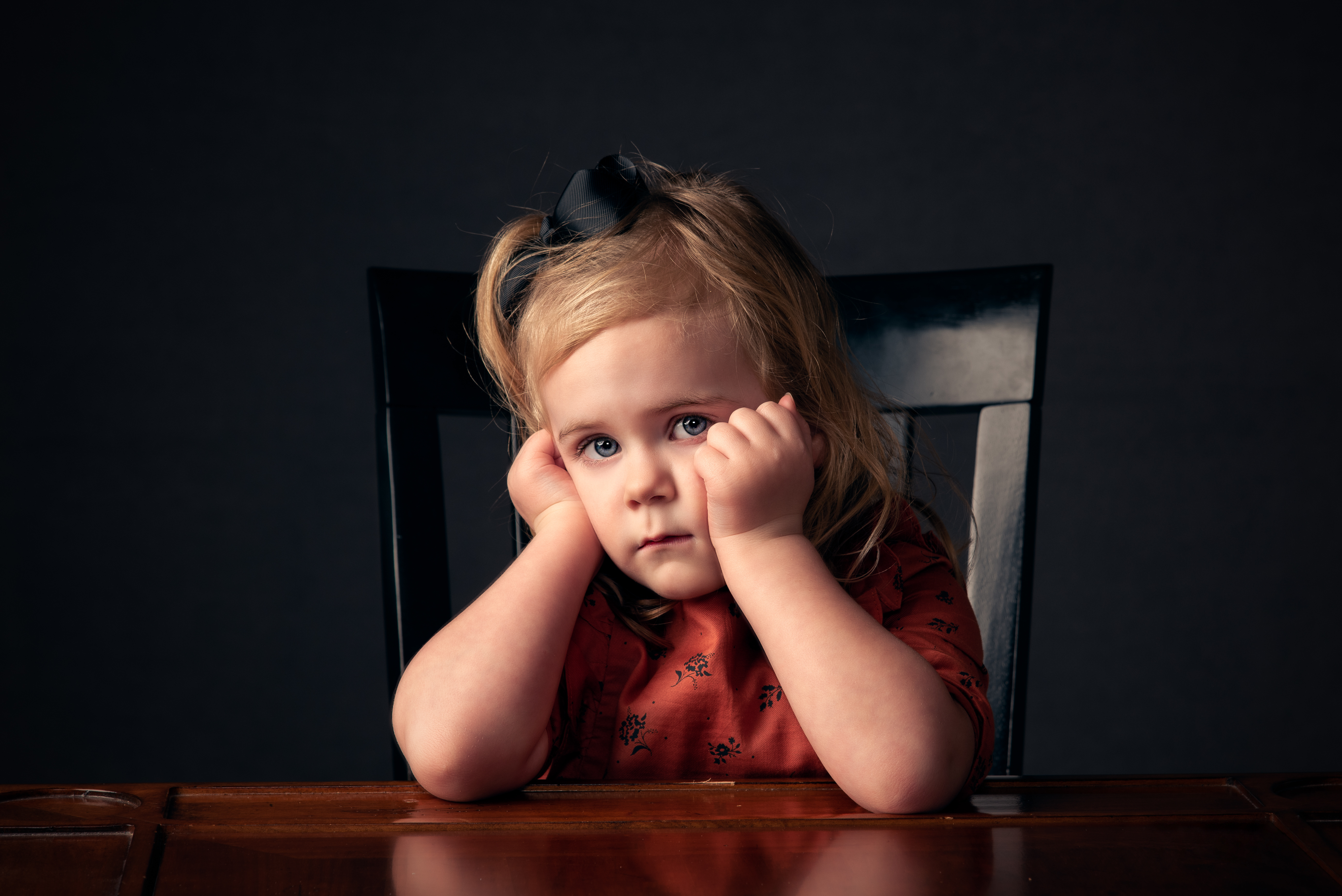 Грустная маленькая девочка сидит за столом - 5210x3478