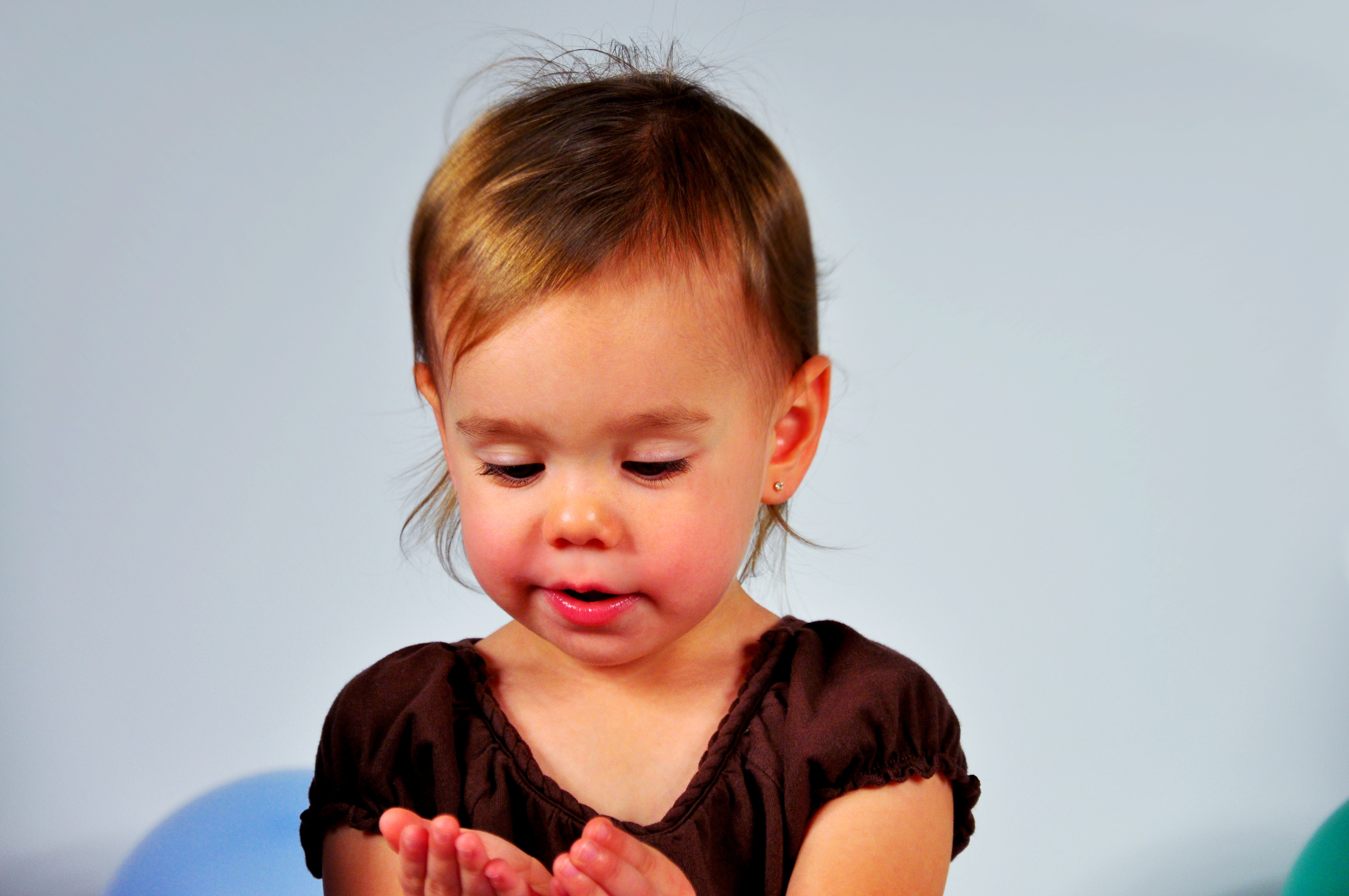 Маленькая девочка смотрит на руки на сером - 4288x2848