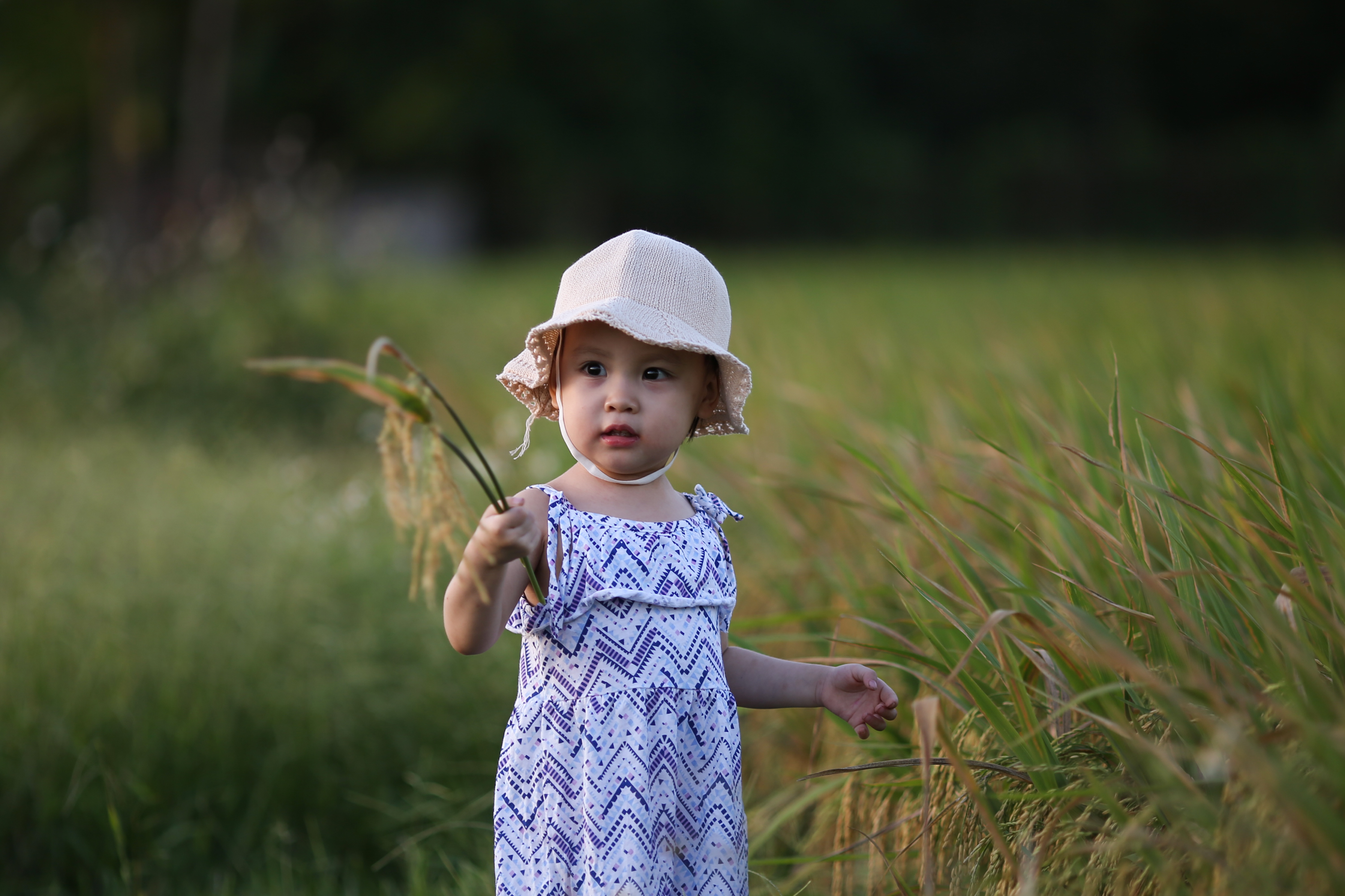 Маленькая девочка азиатка стоит в траве - 6000x4000