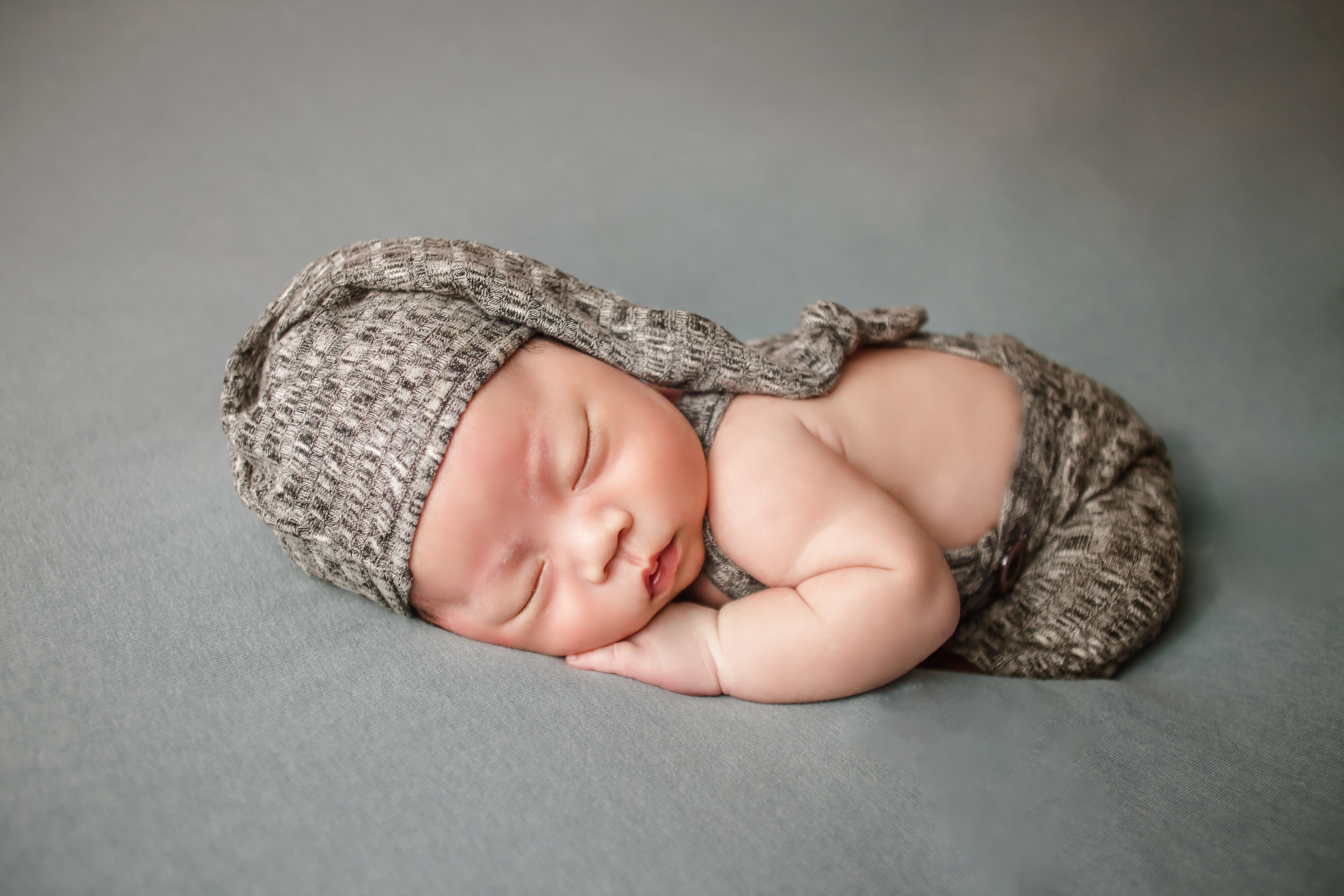 Маленький новорожденный ребенок на сером фоне - 5472x3648