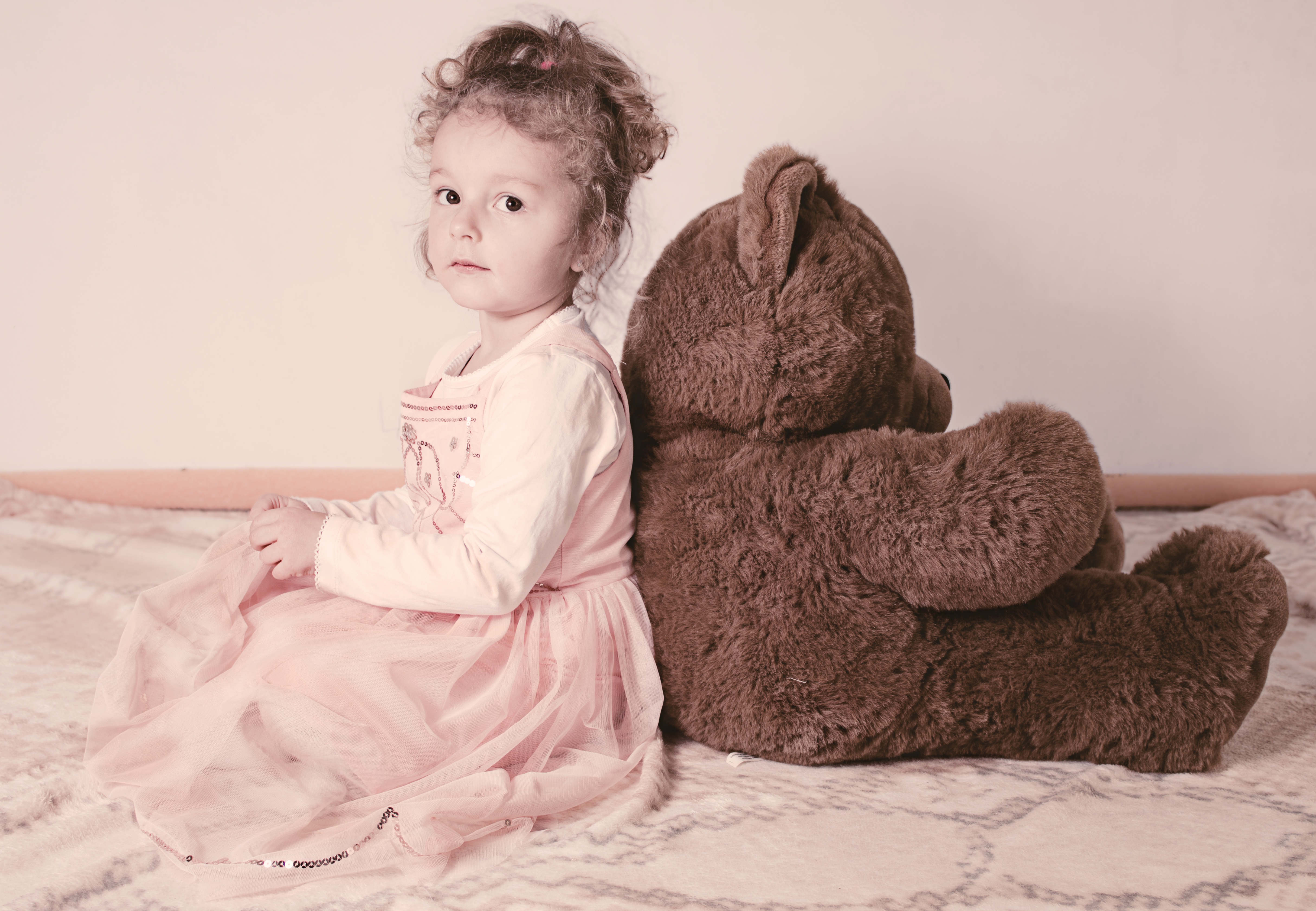 Маленькая девочка сидит с большим медведем - 4856x3363