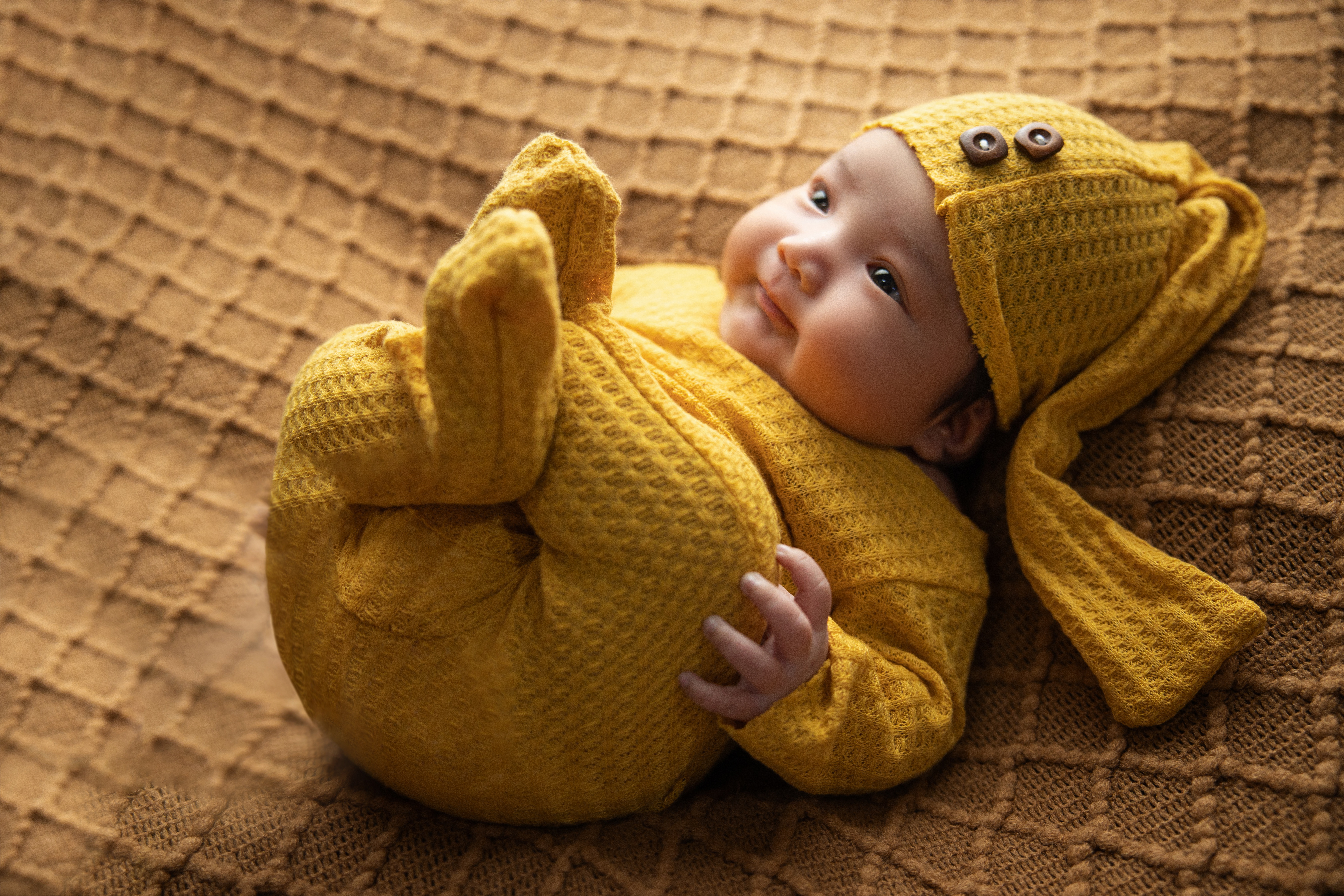 Новорожденный ребенок в желтом костюме - 6720x4480