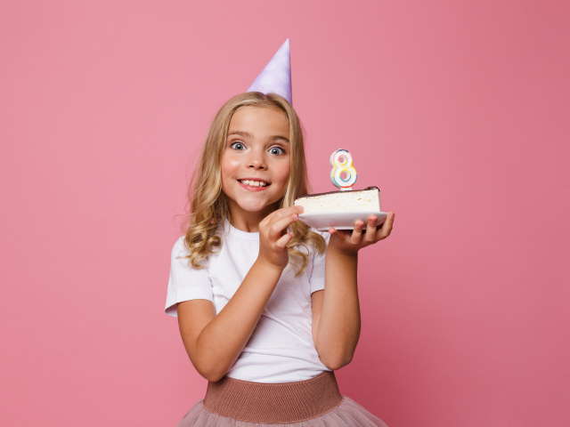 Обои: Милая девочка отмечает день рождения на розовом фоне
