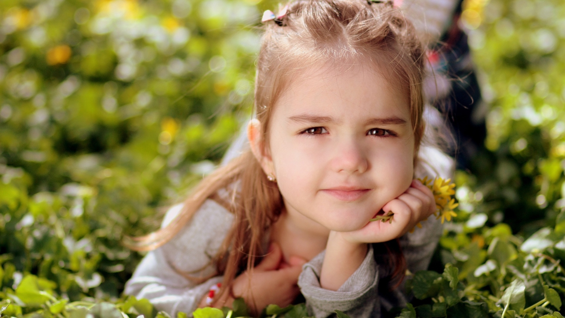 Милая кареглазая девочка лежит на траве Обои для рабочего стола 1920x1080