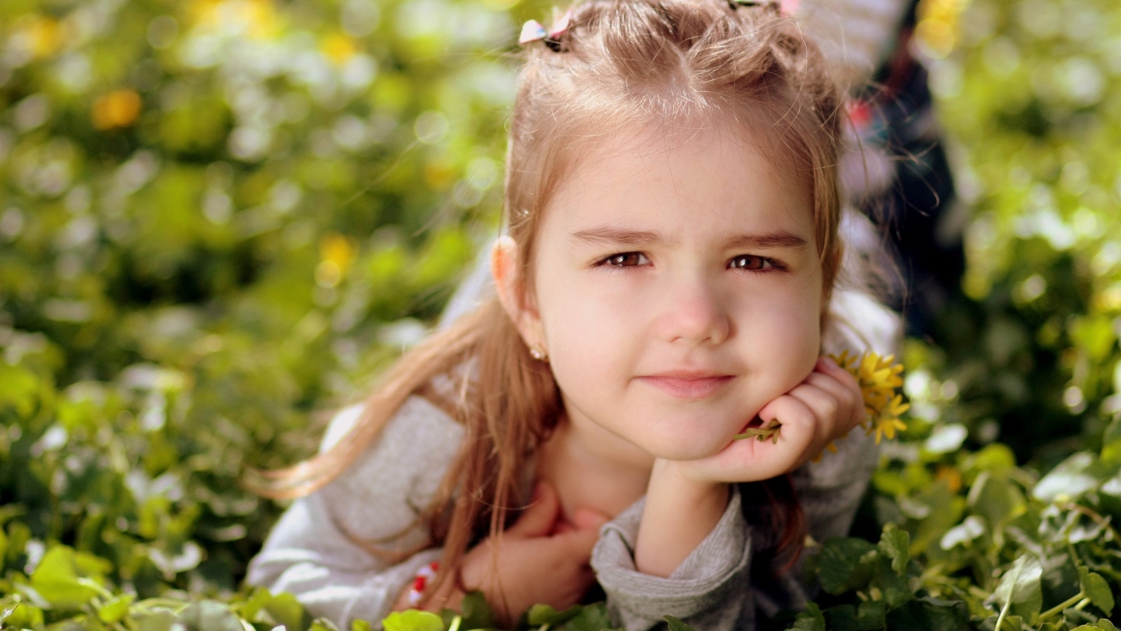Милая кареглазая девочка лежит на траве Обои для рабочего стола 1600x900