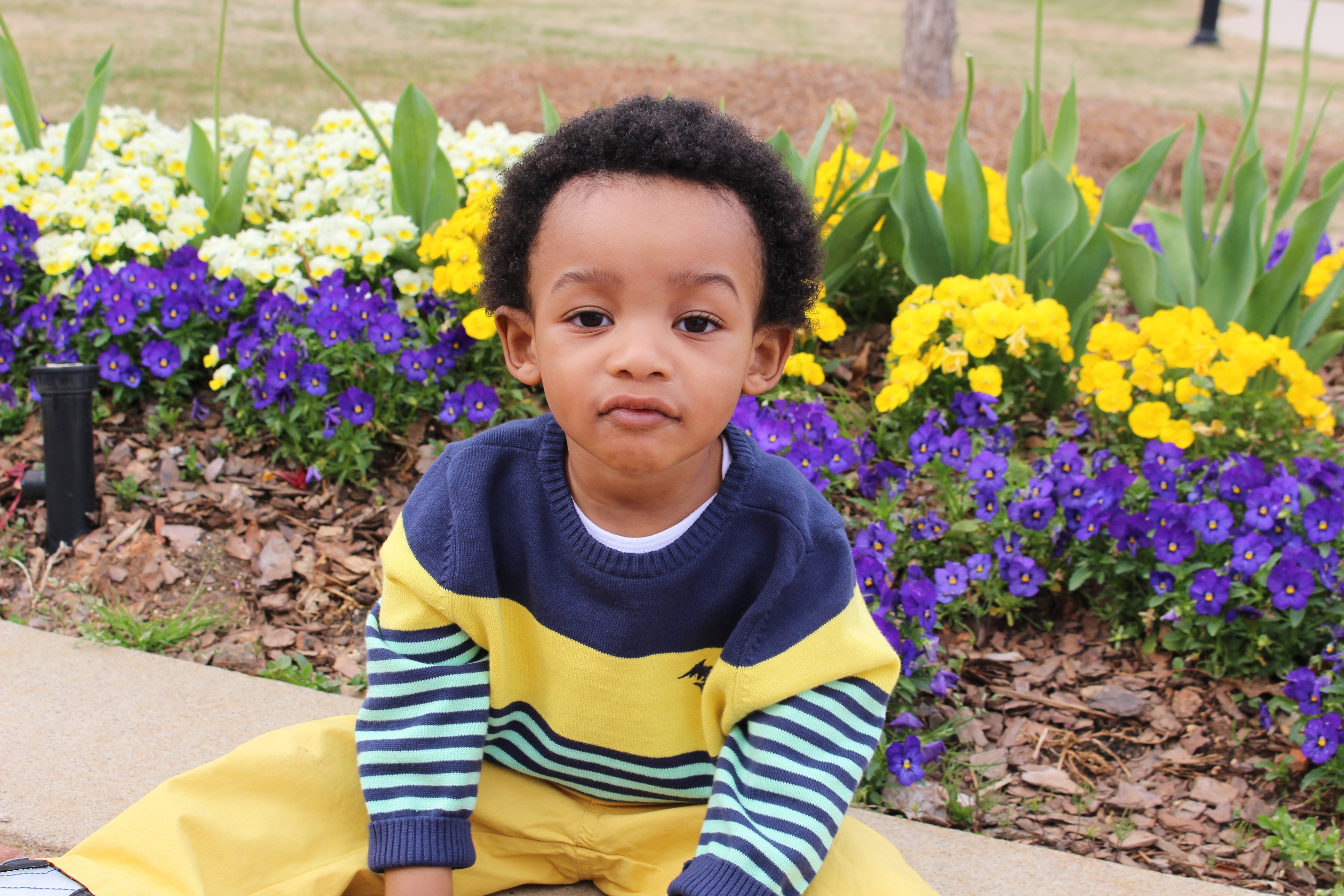 Темнокожий мальчик у клумбы с цветами - 5184x3456