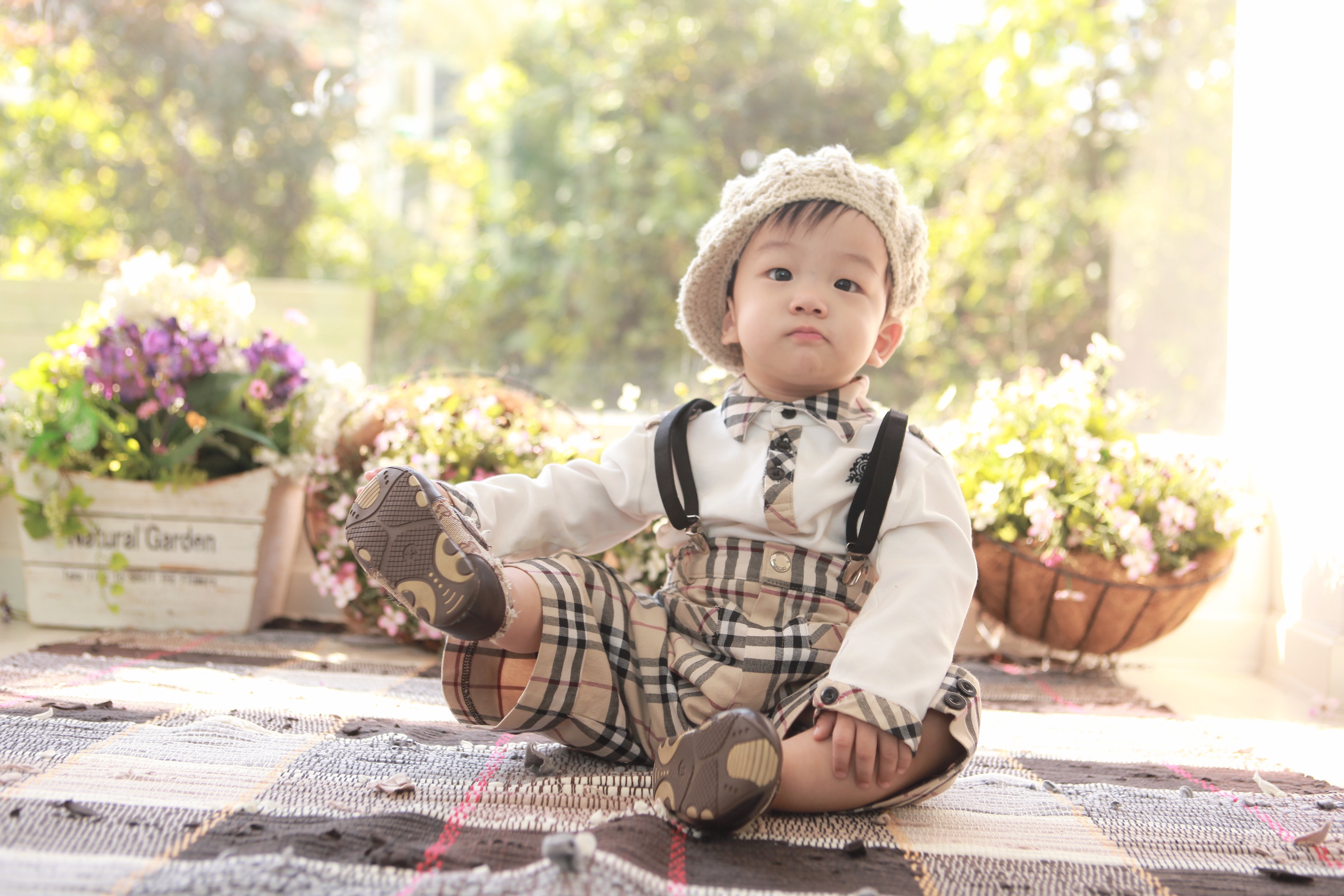 Смешной мальчик азиат у цветов - 4080x2720