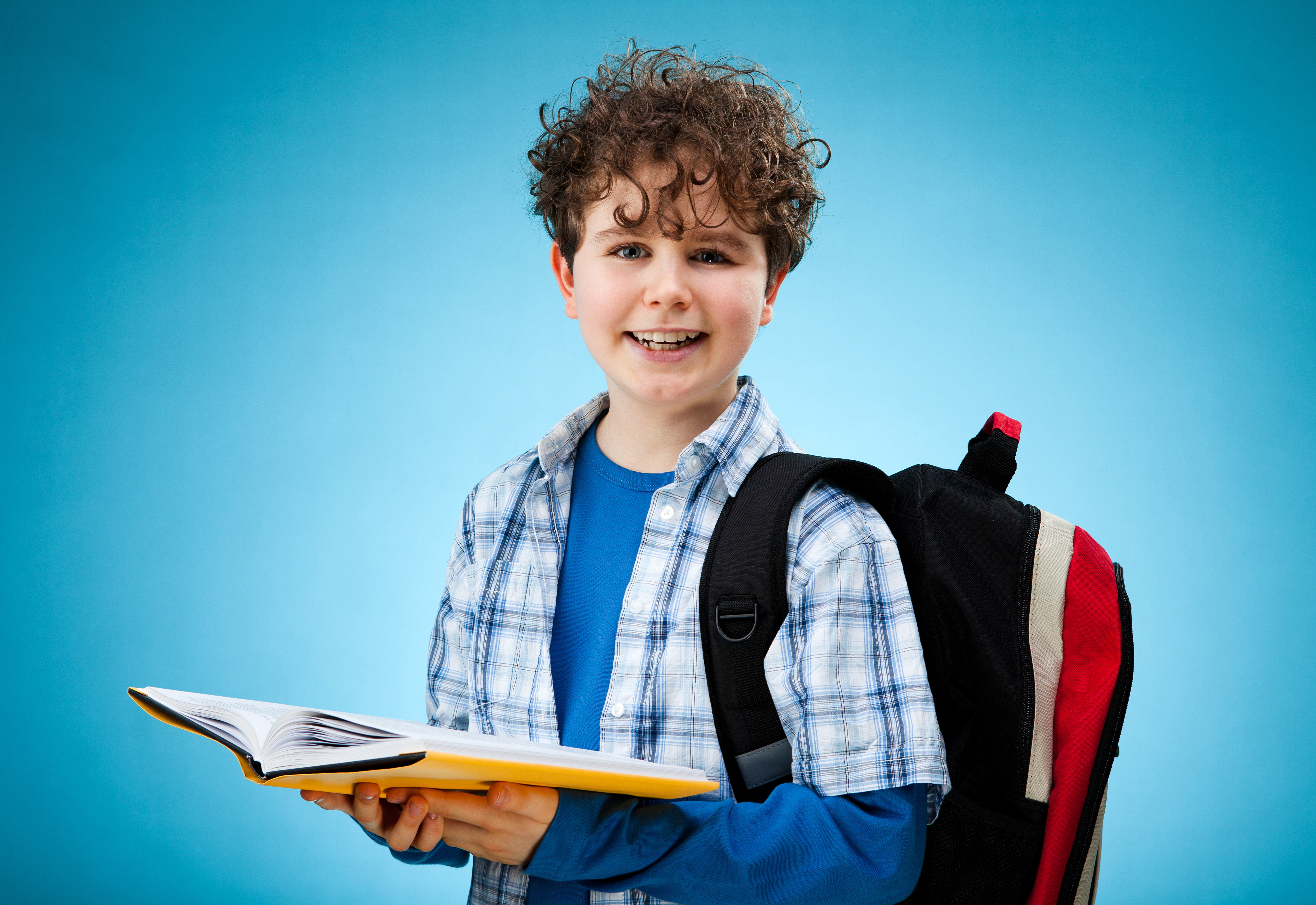 Улыбающийся школьник с книгой и портфелем - 5186x3565