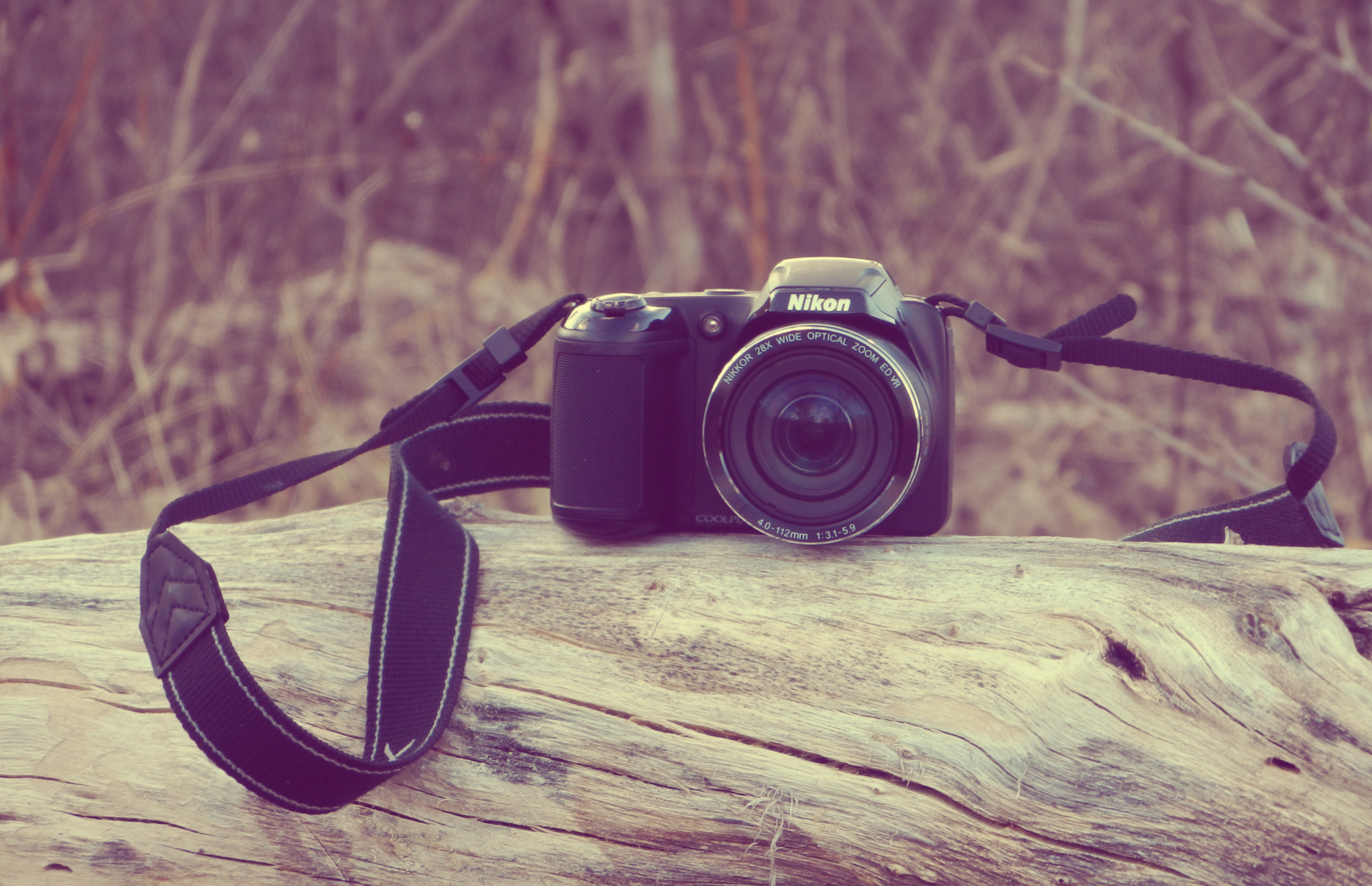 Фотоаппарат Nikon лежит на сухом дереве - 3997x2583