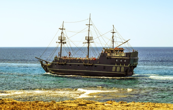 Большой черный пиратский корабль у берега