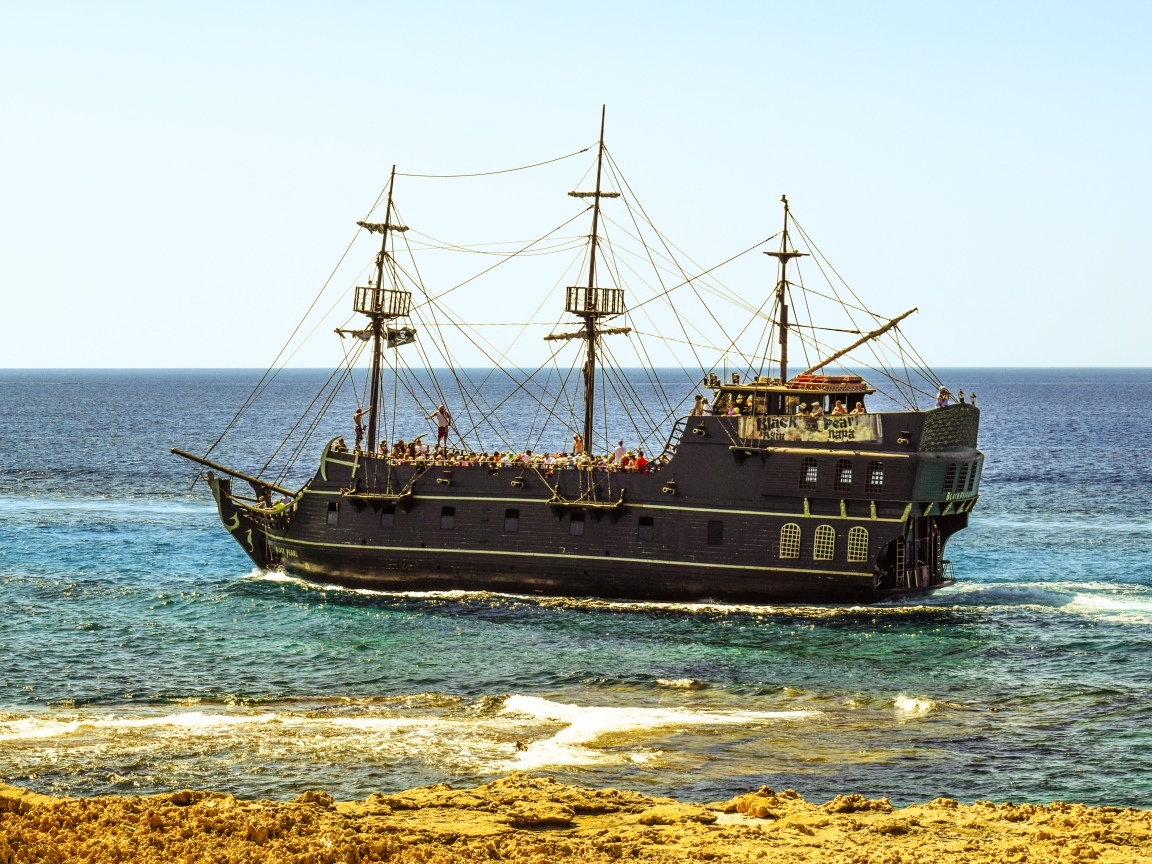 Большой черный пиратский корабль у берега Обои для рабочего стола 1152x864