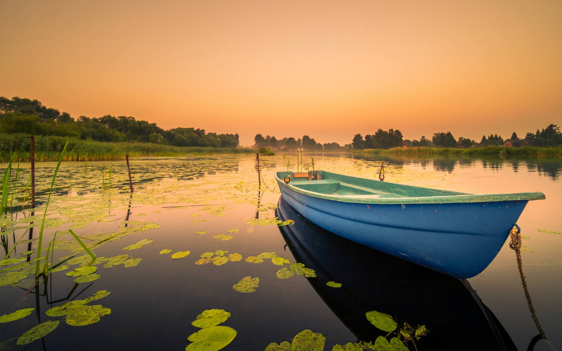 Голубая лодка в озере на закате солнца Обои для рабочего стола 1920x1200