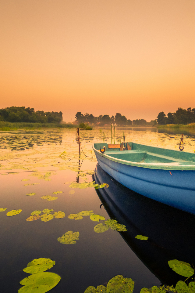 Голубая лодка в озере на закате солнца Обои для рабочего стола 640x960