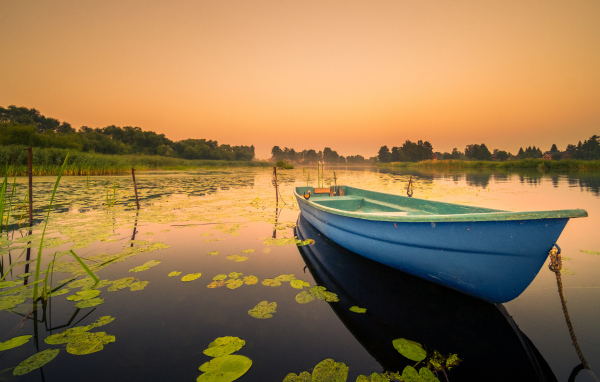 Голубая лодка в озере на закате солнца Обои для рабочего стола 600x382