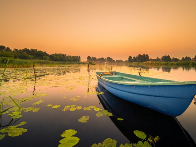 Обои: Голубая лодка в озере на закате солнца