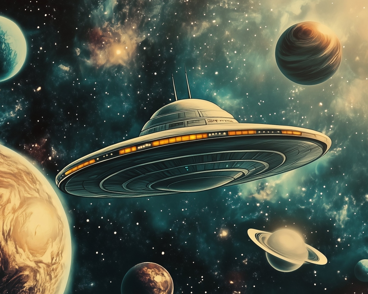 Летающая тарелка в космосе с планетами Обои для рабочего стола 1280x1024