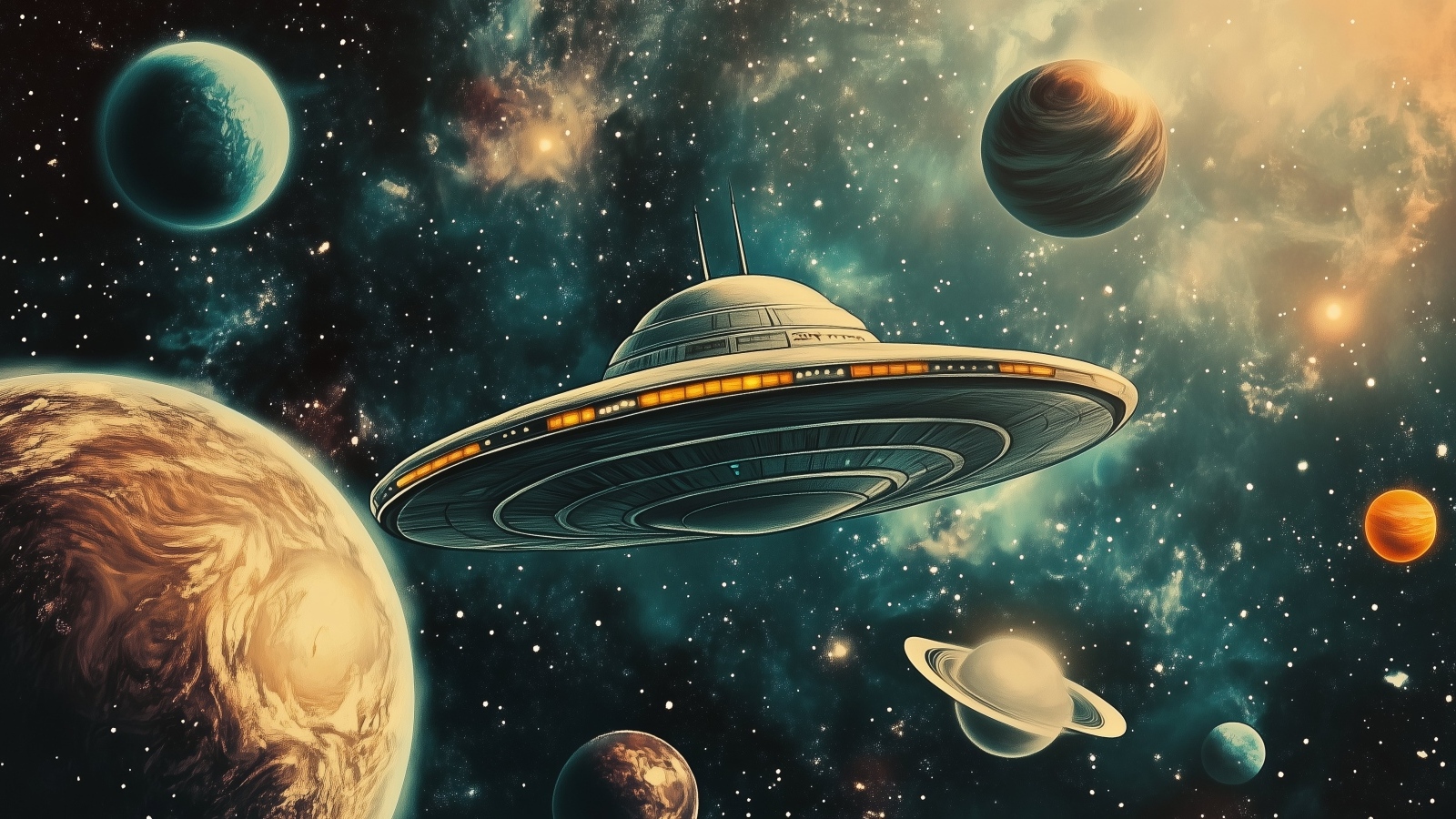Летающая тарелка в космосе с планетами Обои для рабочего стола 1600x900