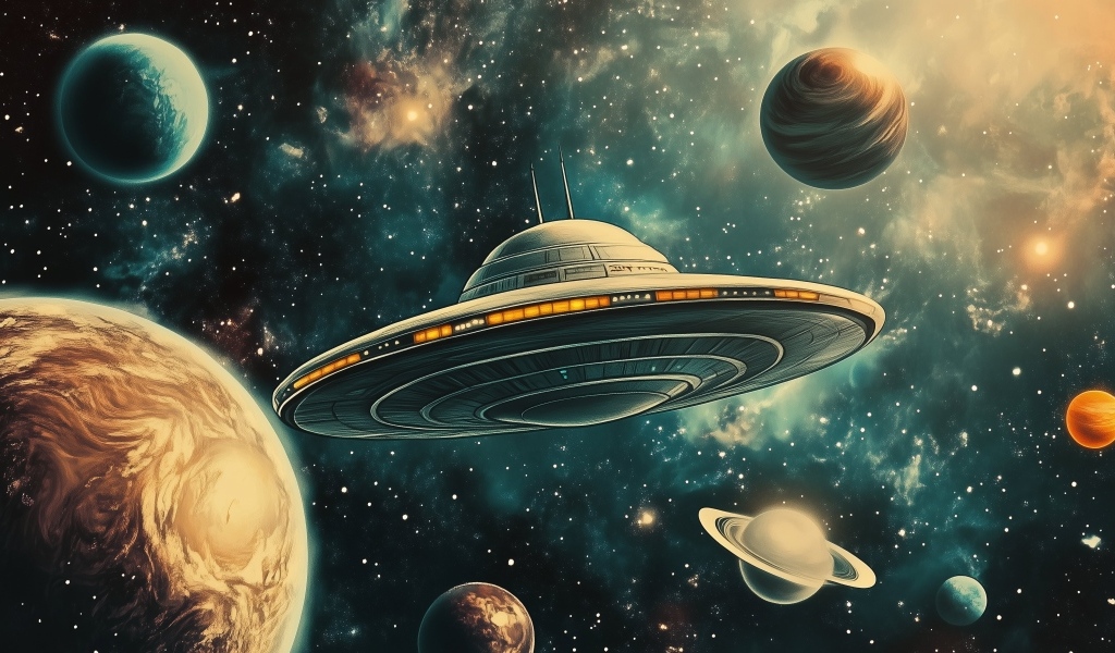 Летающая тарелка в космосе с планетами Обои для рабочего стола 1024x600