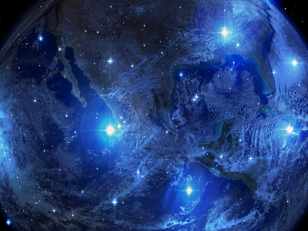 Яркие вспышки на планете Земля в голубом космосе Обои для рабочего стола 1024x768