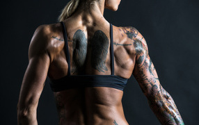 Колючей проволокой проколот живот молодой девушки с татуировкой