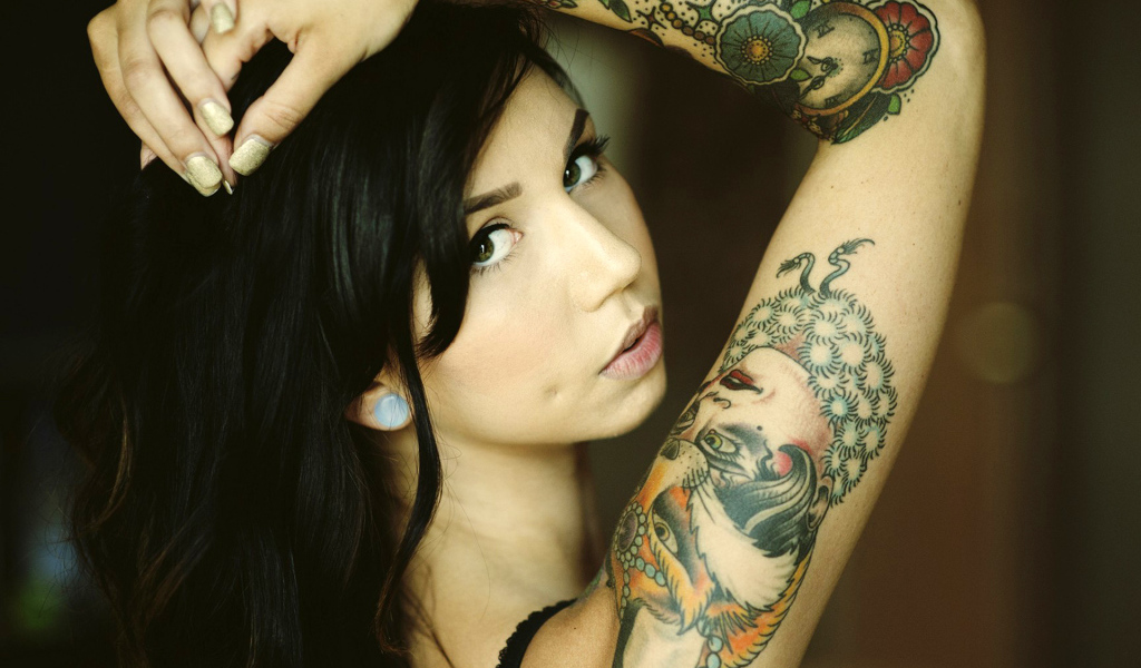 Черноволосая девушка с татуировкой на руке Обои для рабочего стола 1024x600