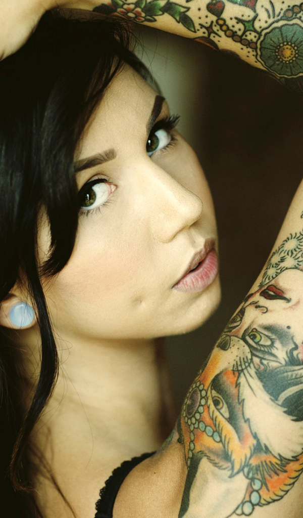 Черноволосая девушка с татуировкой на руке Обои для рабочего стола 600x1024