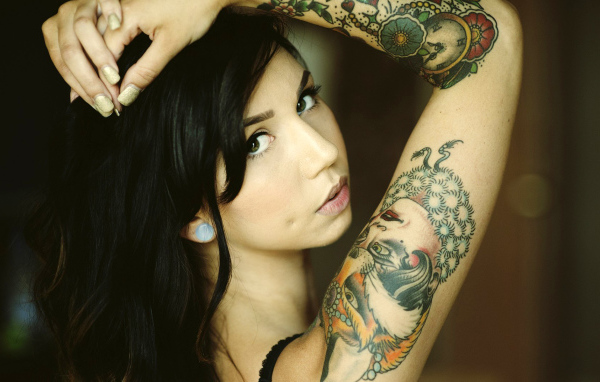 Черноволосая девушка с татуировкой на руке Обои для рабочего стола 600x382