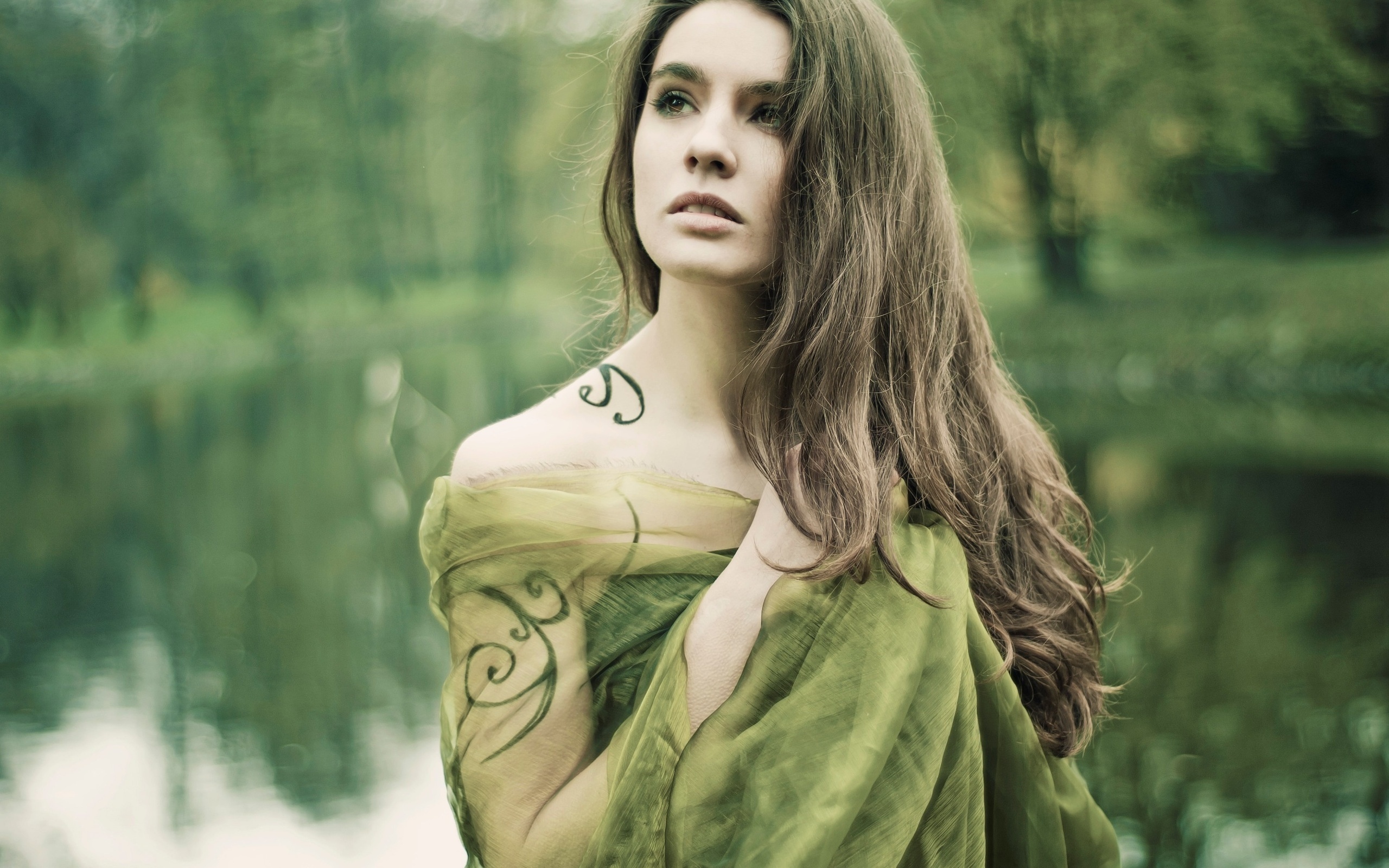Девушка в зеленом с тату Обои для рабочего стола 1440x900