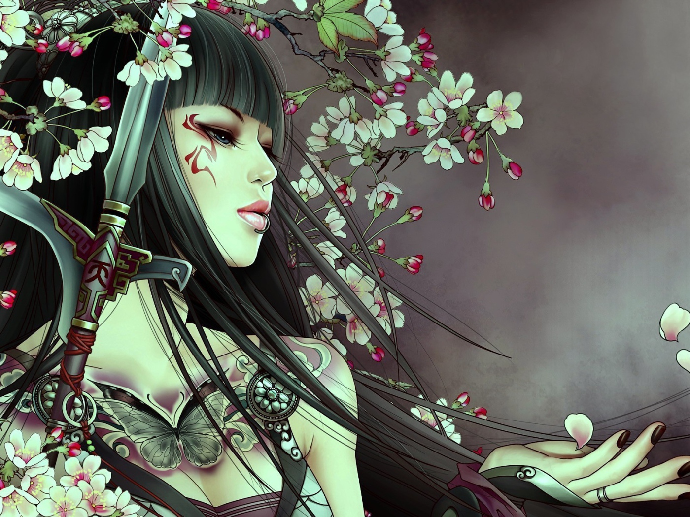 Девушка самурай с татуировкой Обои для рабочего стола 1400x1050