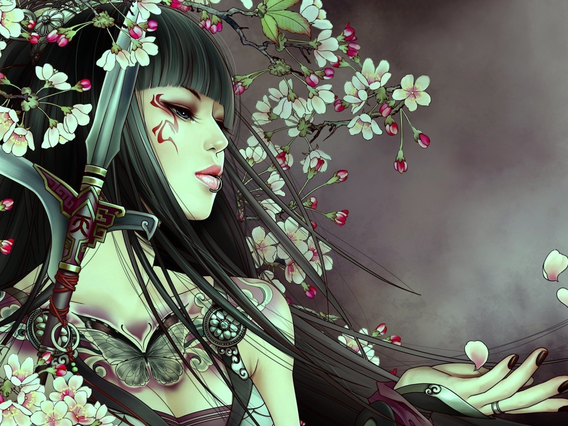 Девушка самурай с татуировкой Обои для рабочего стола 1152x864