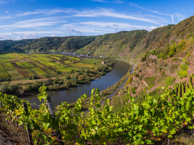 Обои: Вид на виноградники у реки под голубым небом, Германия