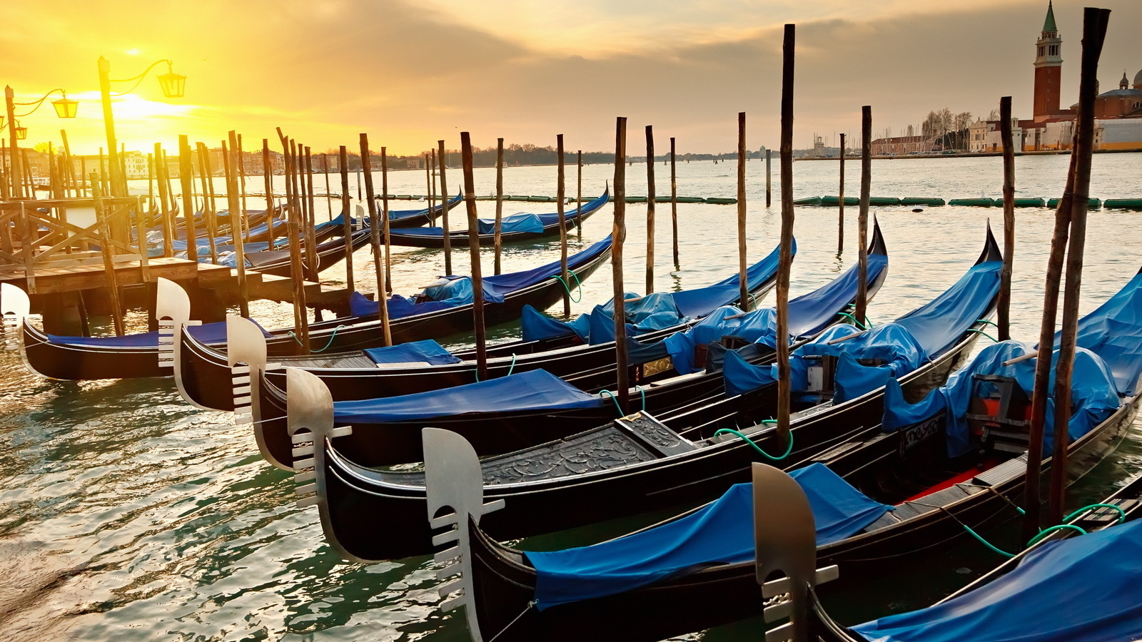 Гондолы на фоне заката в Венеции, Италия Обои для рабочего стола 1600x900