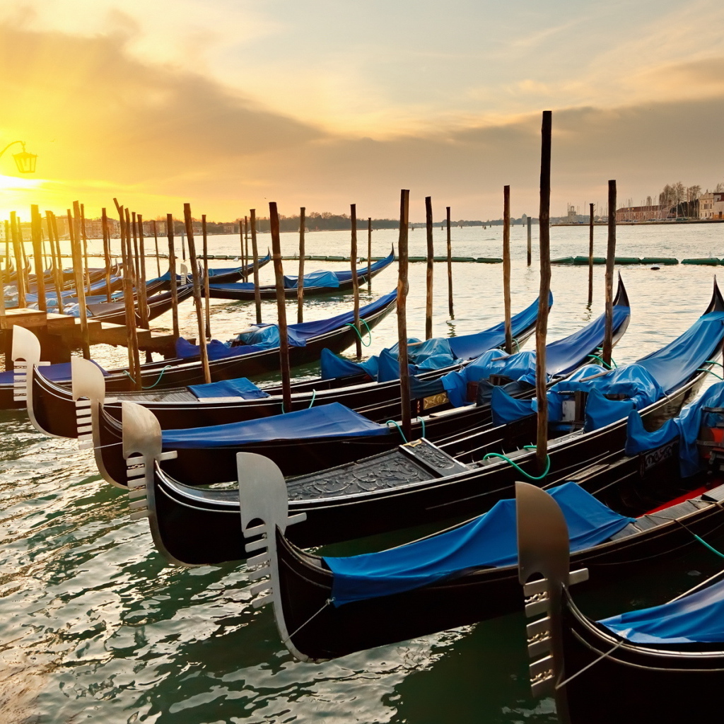 Гондолы на фоне заката в Венеции, Италия Обои для рабочего стола 1024x1024